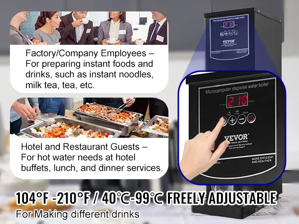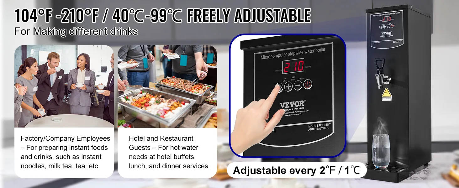 Precyzyjna kontrola temperatury: Dzięki regulowanemu zakresowi od 40°C do 99°C (104°F–210°F) masz pełną kontrolę nad temperaturą wody dla różnych napojów. Cyfrowy wyświetlacz LED wyraźnie pokazuje aktualną temperaturę i umożliwia łatwe monitorowanie procesu podgrzewania. Podgrzewacz napełnia się automatycznie i utrzymuje wybraną temperaturę. Dzięki funkcji pamięci ustawienia są zapisywane nawet po zaniku zasilania.