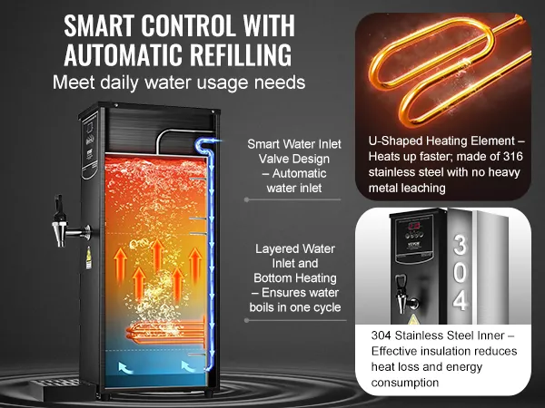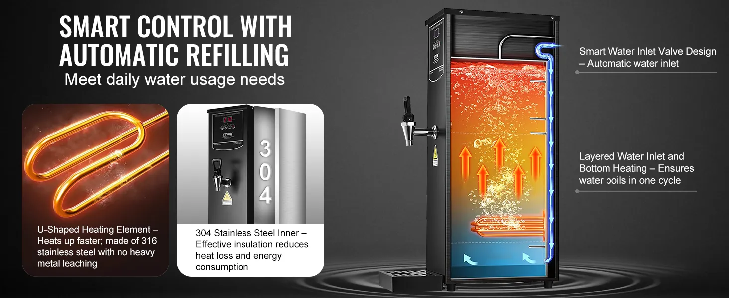 Element grzejny ze stali nierdzewnej 316 zapewnia bezpieczną wodę pitną, wolną od metali ciężkich. Dzięki w pełni automatycznemu systemowi zaopatrzenia w wodę, ręczne uzupełnianie jest zbędne. System stopniowego podgrzewania podgrzewa tylko wymaganą ilość wody, minimalizując straty wody i zużycie energii.