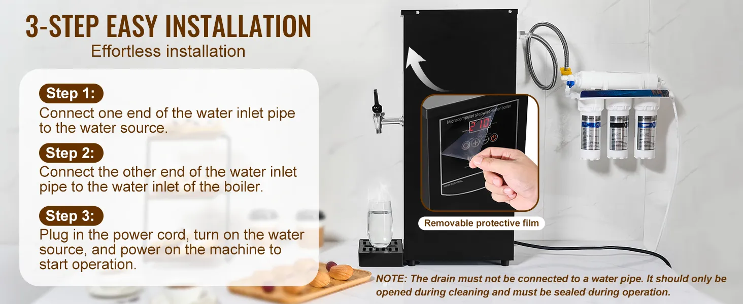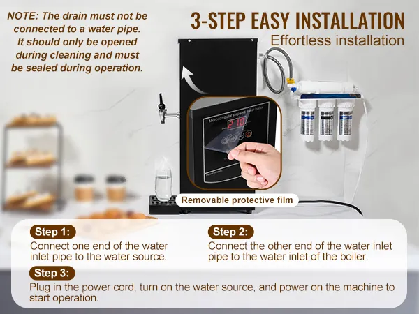 Podłącz wąż doprowadzający wodę bezpośrednio do źródła wody i wlotu kotła – dla szybkiej i łatwej instalacji. Ze względu na regionalne różnice w jakości wody, zaleca się czyszczenie podgrzewacza wody co 1–2 miesiące, aby zapewnić optymalną wydajność.