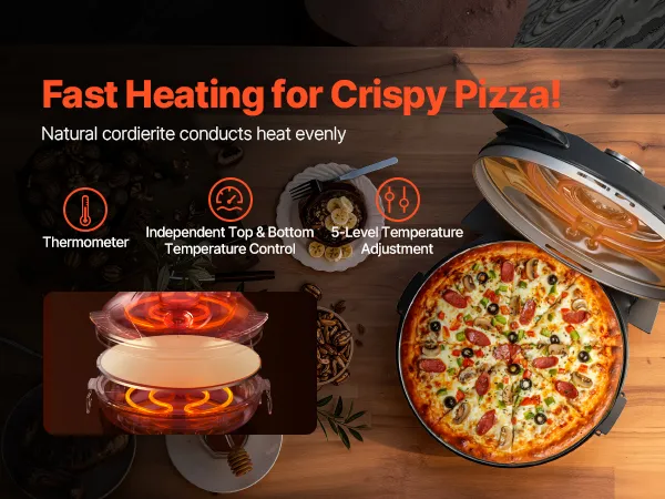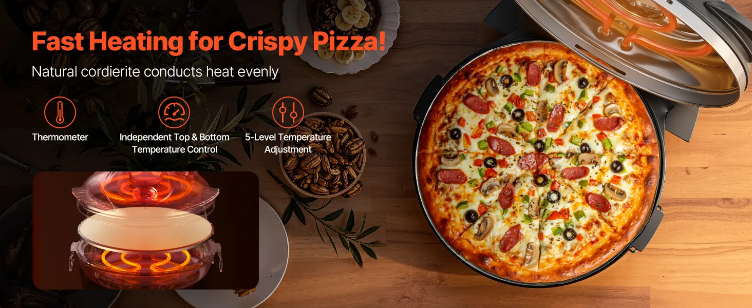 Równomierne rozprowadzanie ciepła: Podwójne sterowanie naszego elektrycznego pieca do pizzy reguluje grzanie górne i dolne w 5 etapach. Wyświetlacz temperatury i górne okienko pokazują postęp pieczenia, a naturalny kamień kordierytowy zapewnia równomierne nagrzewanie, zapewniając chrupiącą, idealnie wypieczoną pizzę.