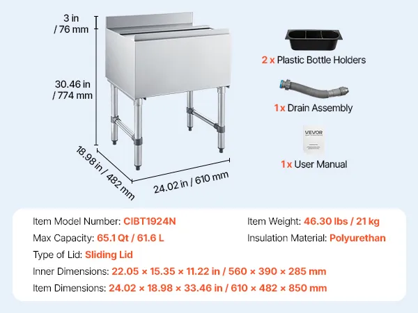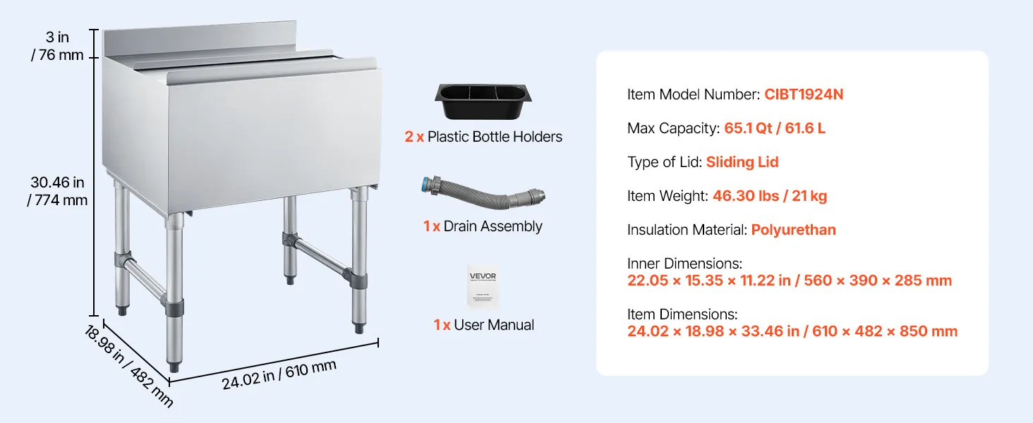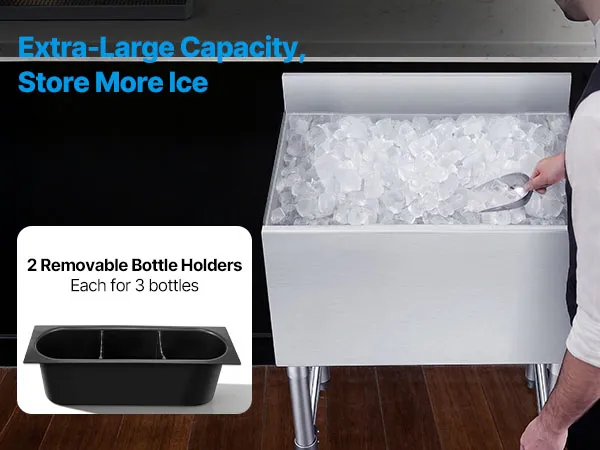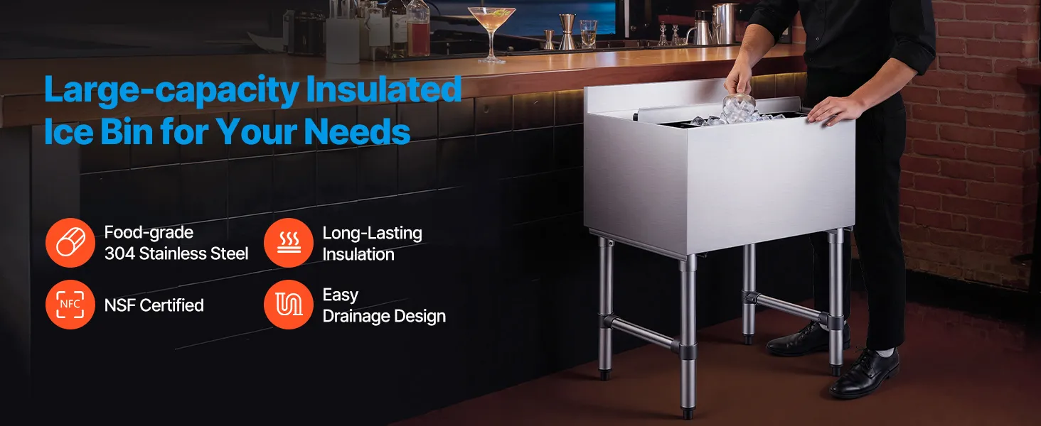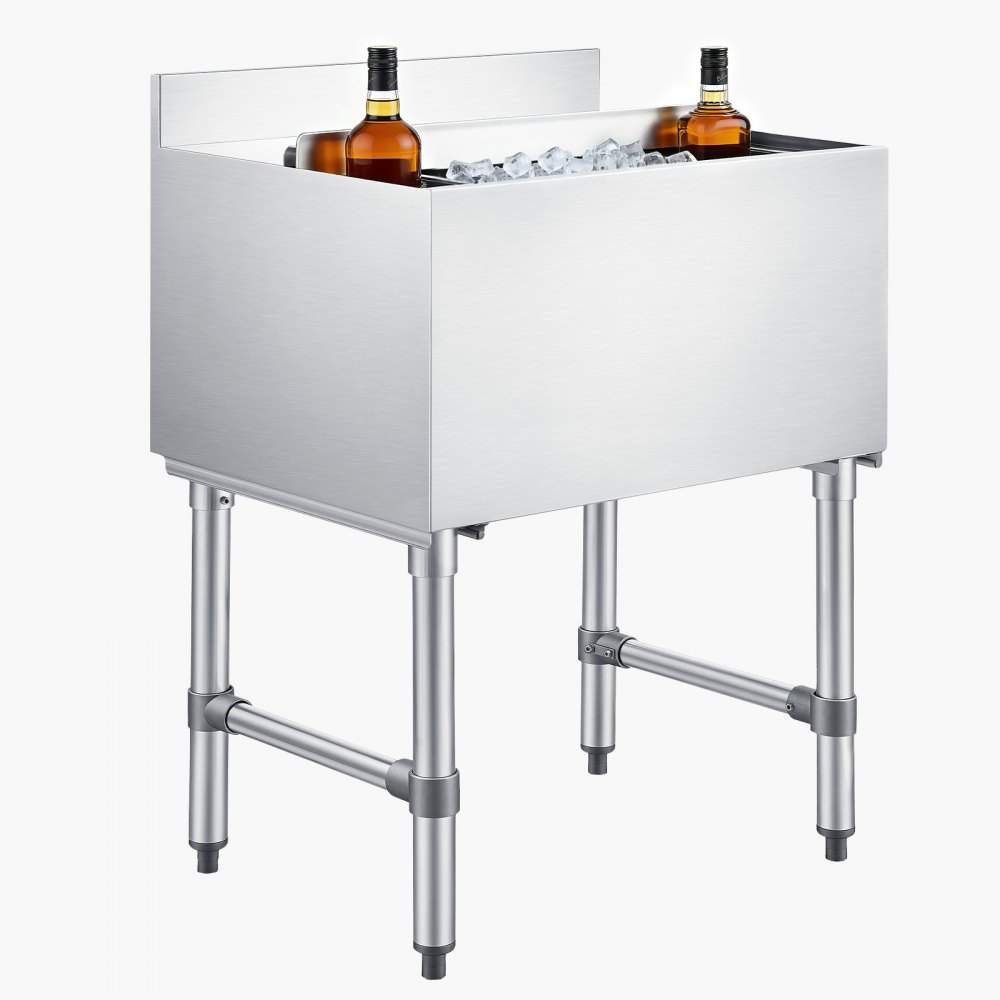 Pojemnik na lód VEVOR Catering 61,6 l, stal nierdzewna, podblatowy pojemnik na lód, 610 x 482 x 850 mm, z przesuwaną pokrywą, uchwytami na butelki i regulowanymi nóżkami, do barów, restauracji i pubów, certyfikat NSF