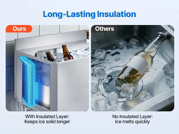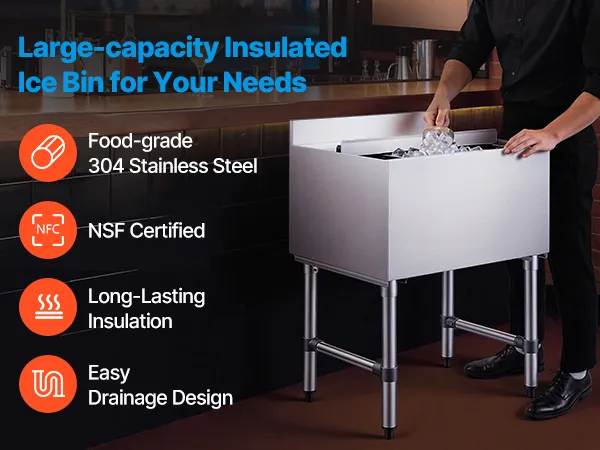 • Certyfikowany przez NSF i trwała izolacja: Ten komercyjny pojemnik na lód, wykonany ze stali nierdzewnej 304 z grubą izolacją z pianki poliuretanowej, utrzymuje lód w zimnie nawet przez jeden dzień. Certyfikat NSF gwarantuje bezpieczeństwo użytkowania w profesjonalnych zakładach przetwórstwa żywności.