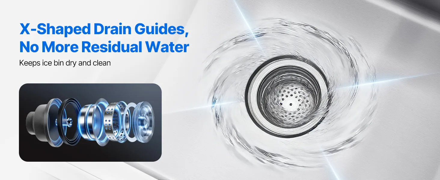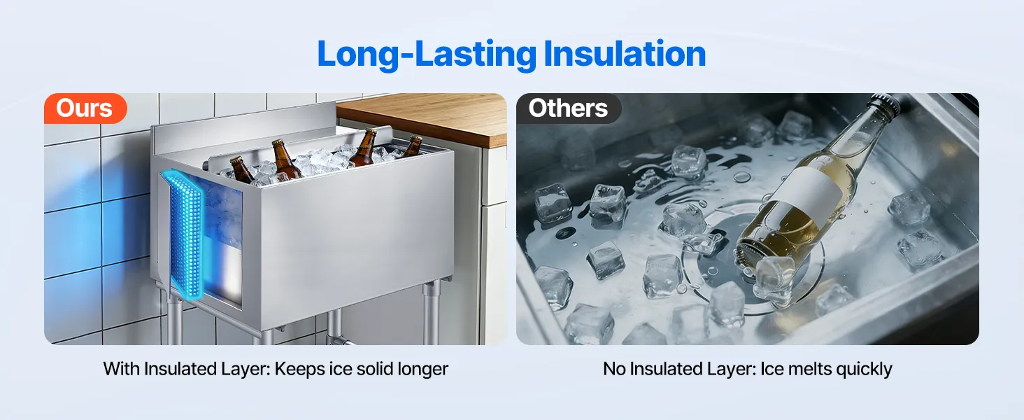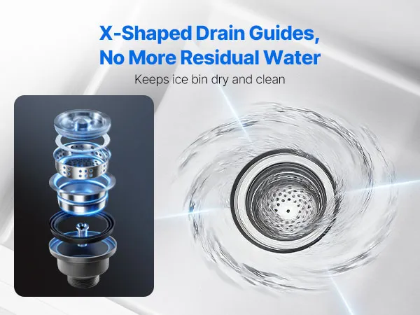 • Optymalny system odprowadzania wody: Ten pojemnik na lód ze stali nierdzewnej posiada system odprowadzania wody w kształcie litery X, który skutecznie odprowadza wodę. Suche wnętrze jest łatwiejsze do czyszczenia i konserwacji podczas codziennego użytku komercyjnego.