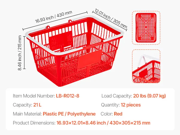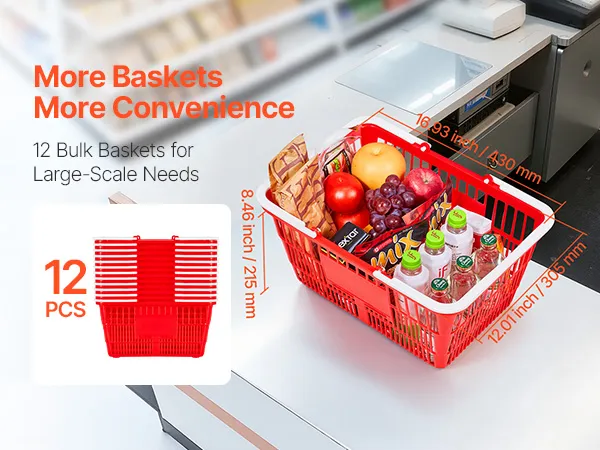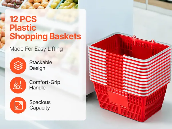 Koszyk zakupowy VEVOR, 12 szt., 21 l, plastikowy kosz transportowy PE z uchwytami, uniwersalny, pojemność do 9,07 kg, kosz piknikowy na żywność, handel detaliczny, sklepy, supermarkety, do użytku domowego, czerwony