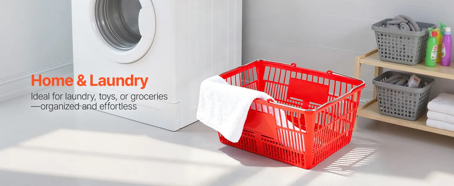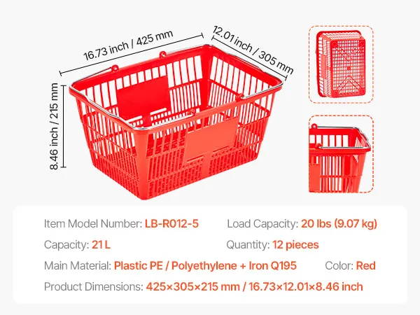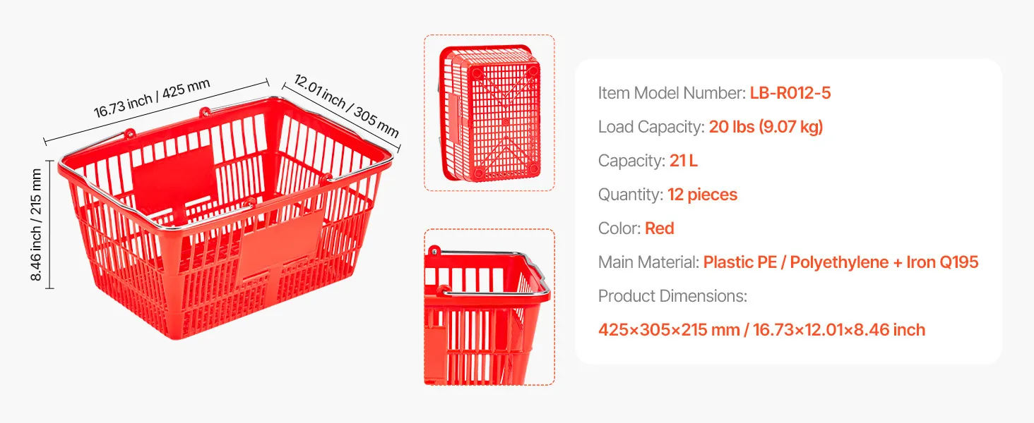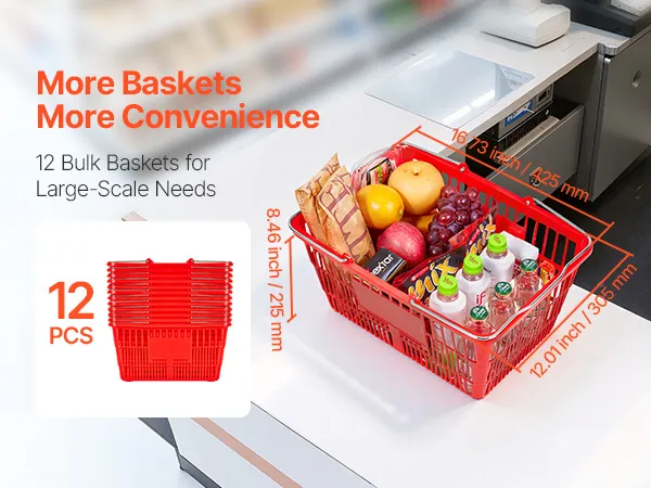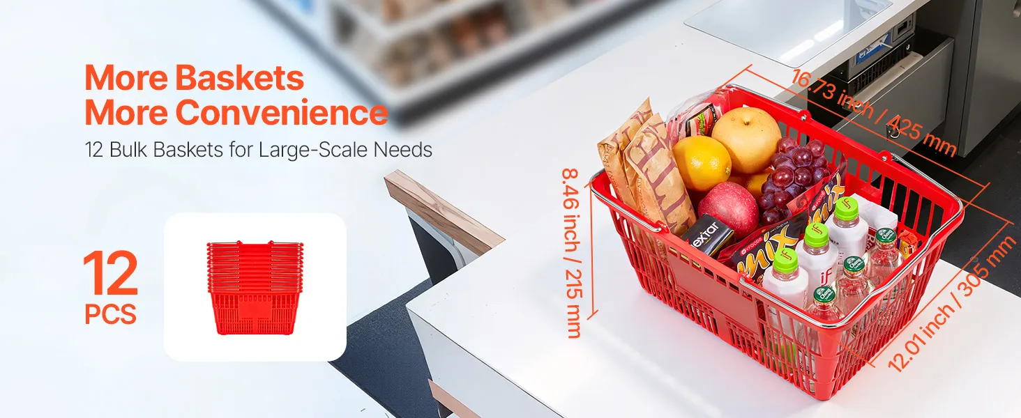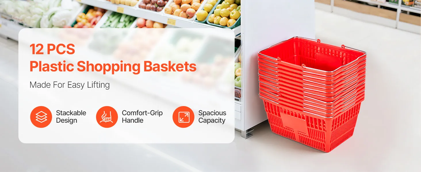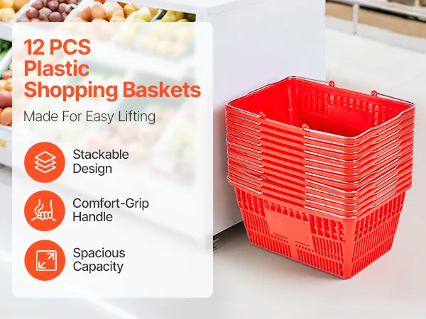 Koszyk zakupowy VEVOR, 12 szt., 21 l, składany, kosz transportowy, kosz z tworzywa sztucznego PE z metalowymi uchwytami, kosz sprzedażowy o ładowności 9,07 kg, do sklepów spożywczych, handlu detalicznego, supermarketów