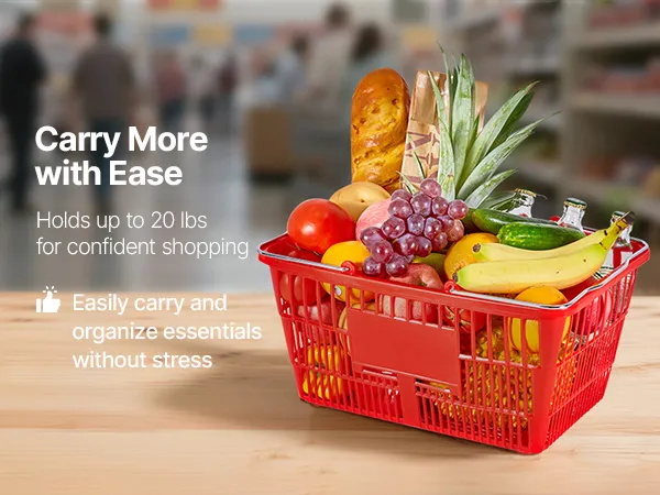 Duża pojemność: Każdy kosz o wymiarach 425 x 305 x 215 mm ma pojemność 21 litrów, co czyni go idealnym na cotygodniowe zakupy. Dostępne w opakowaniach po 12 sztuk, te koszyki zakupowe idealnie nadają się do wspólnego użytku z rodziną. Oferują dużo miejsca na owoce, warzywa, szampon i inne niezbędne produkty codziennego użytku.