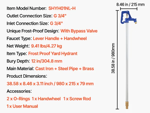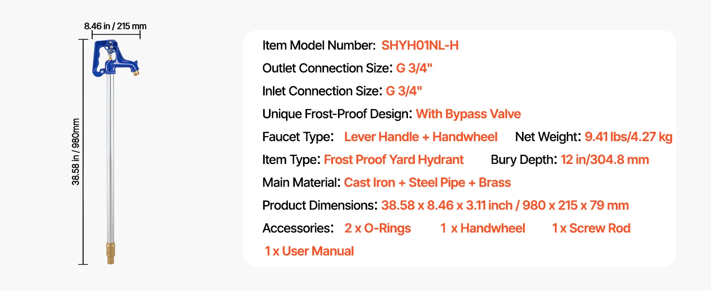 Mrozoodporny hydrant ogrodowy VEVOR ma długość całkowitą 980 mm, głębokość zanurzenia 304,8 mm i zawór obejściowy, co zapewnia płynny przepływ wody nawet w warunkach mrozu. Jego solidna konstrukcja ogranicza przecieki i gwarantuje trwałość – idealny do nawadniania ogrodów, mycia samochodów i podlewania pól.