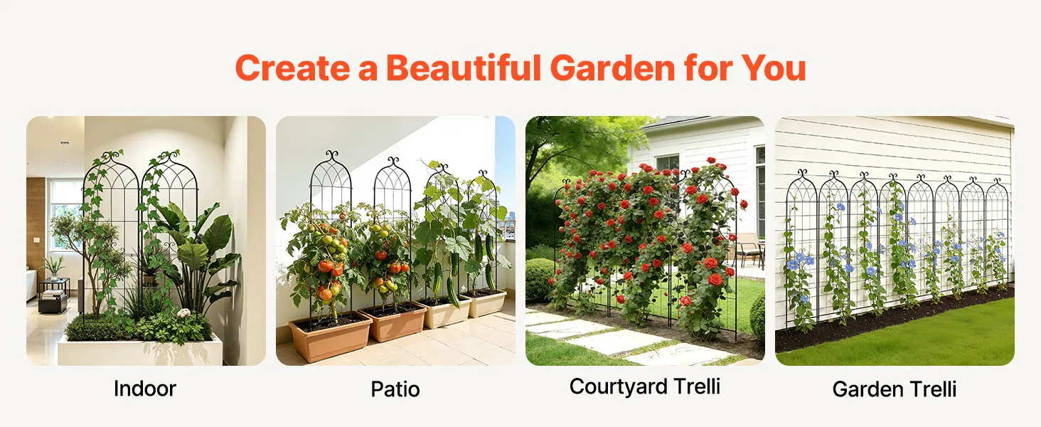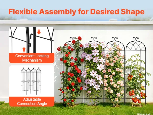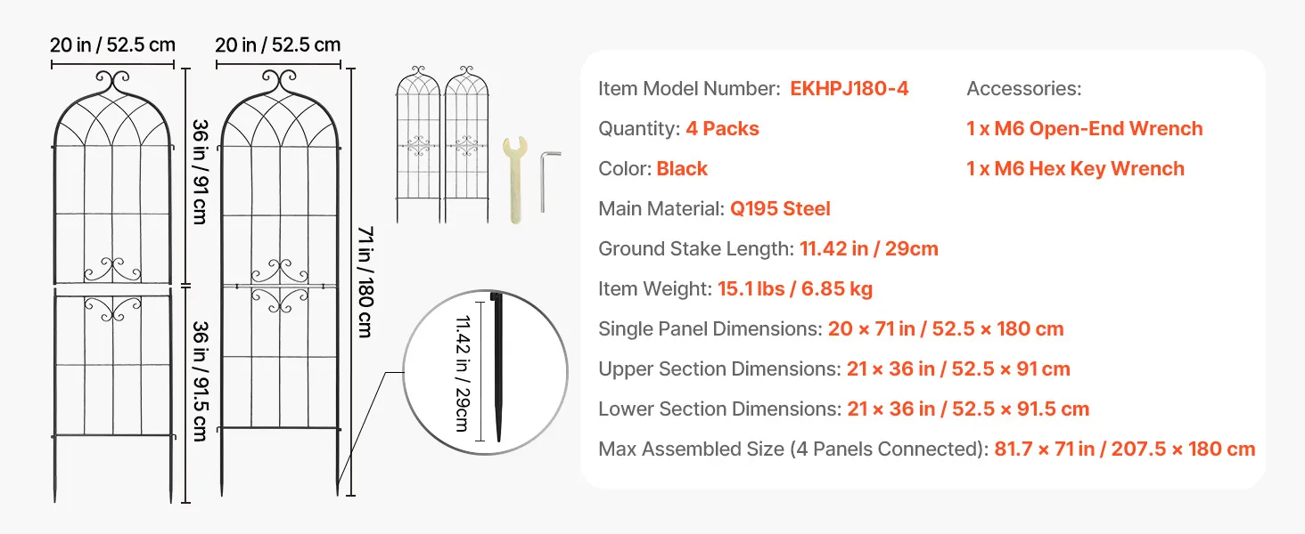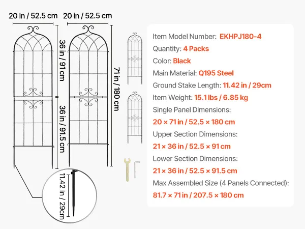 Stabilne podparcie: Ten 4-częściowy zestaw metalowej kratownicy składa się z paneli o wymiarach 52,5 x 180 cm (20 x 71 cali). Dzięki kołkom o długości 29 cm (11,42 cala) można go mocno zakotwiczyć w glebie, trawie lub wilgotnym podłożu, zapewniając bezpieczne podparcie dla roślin pnących.