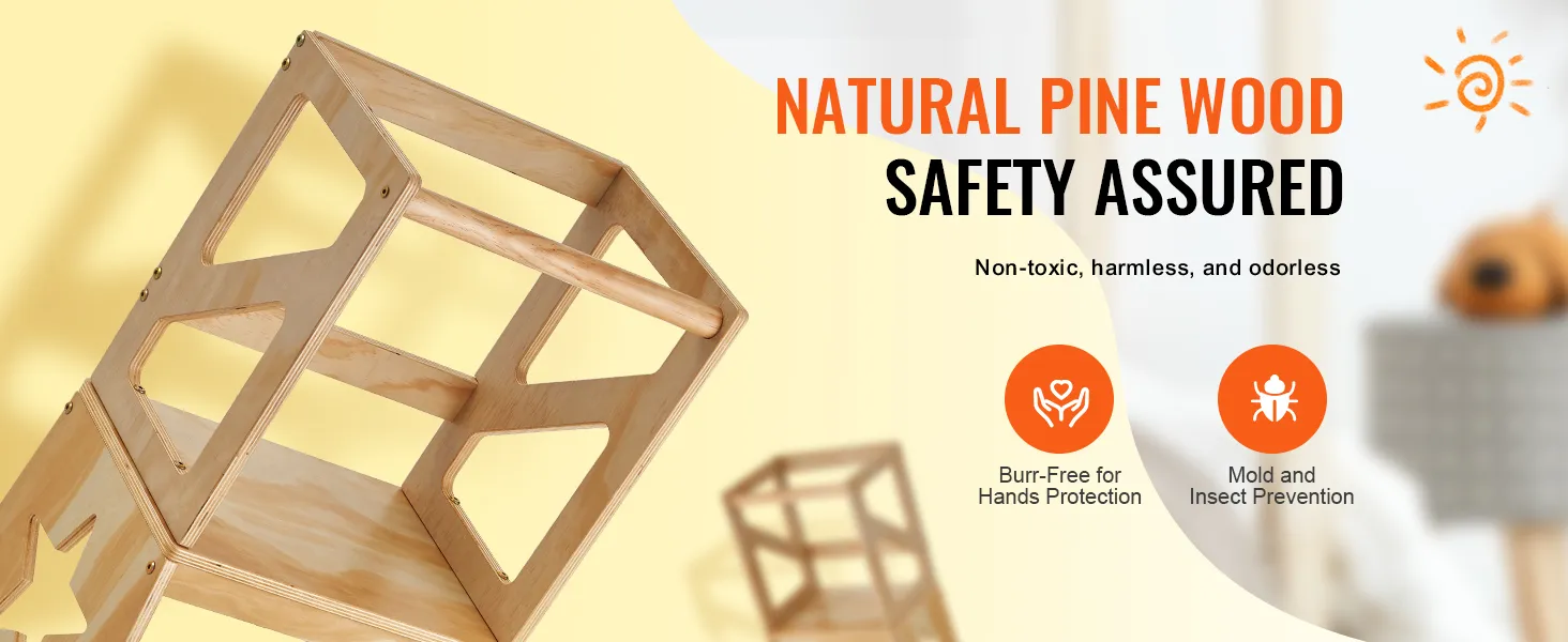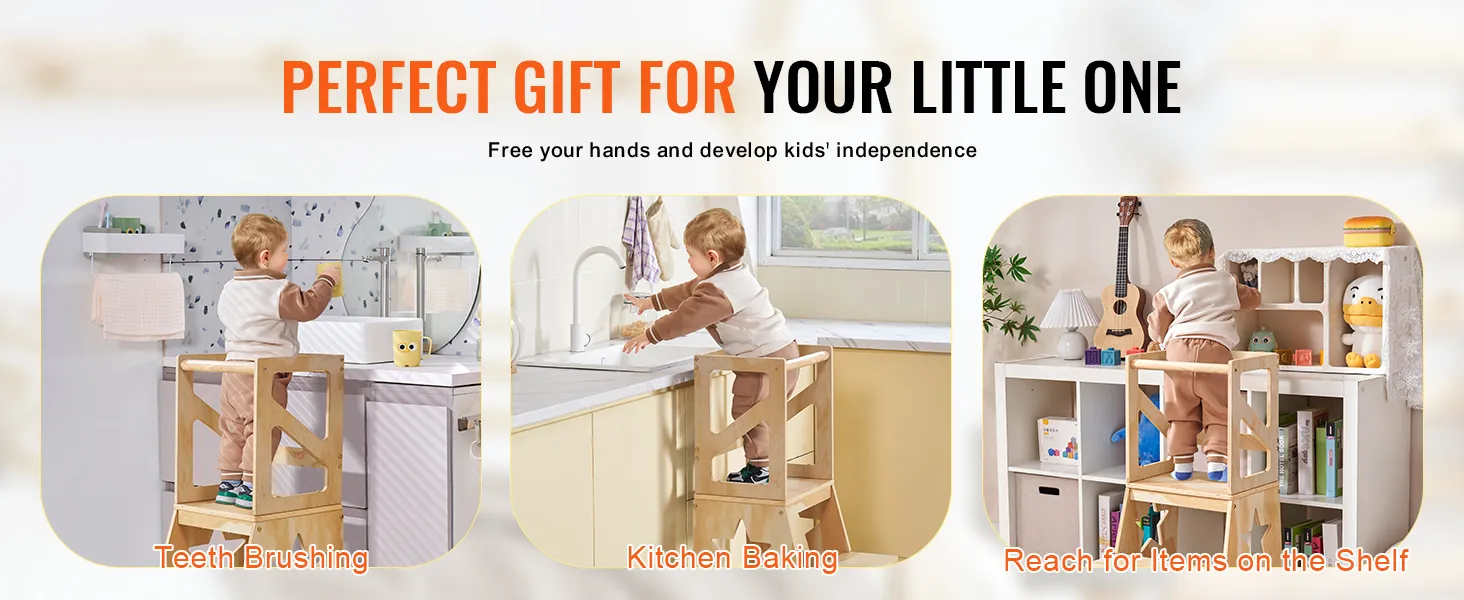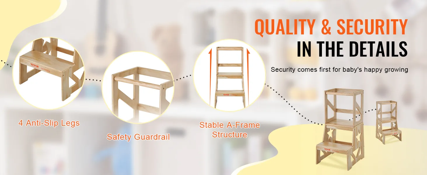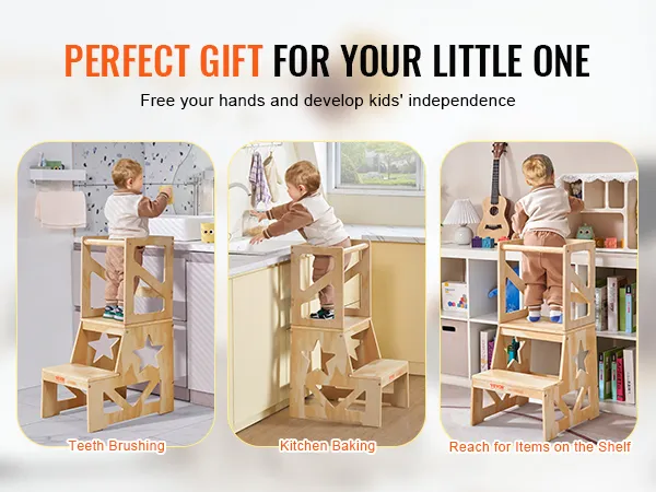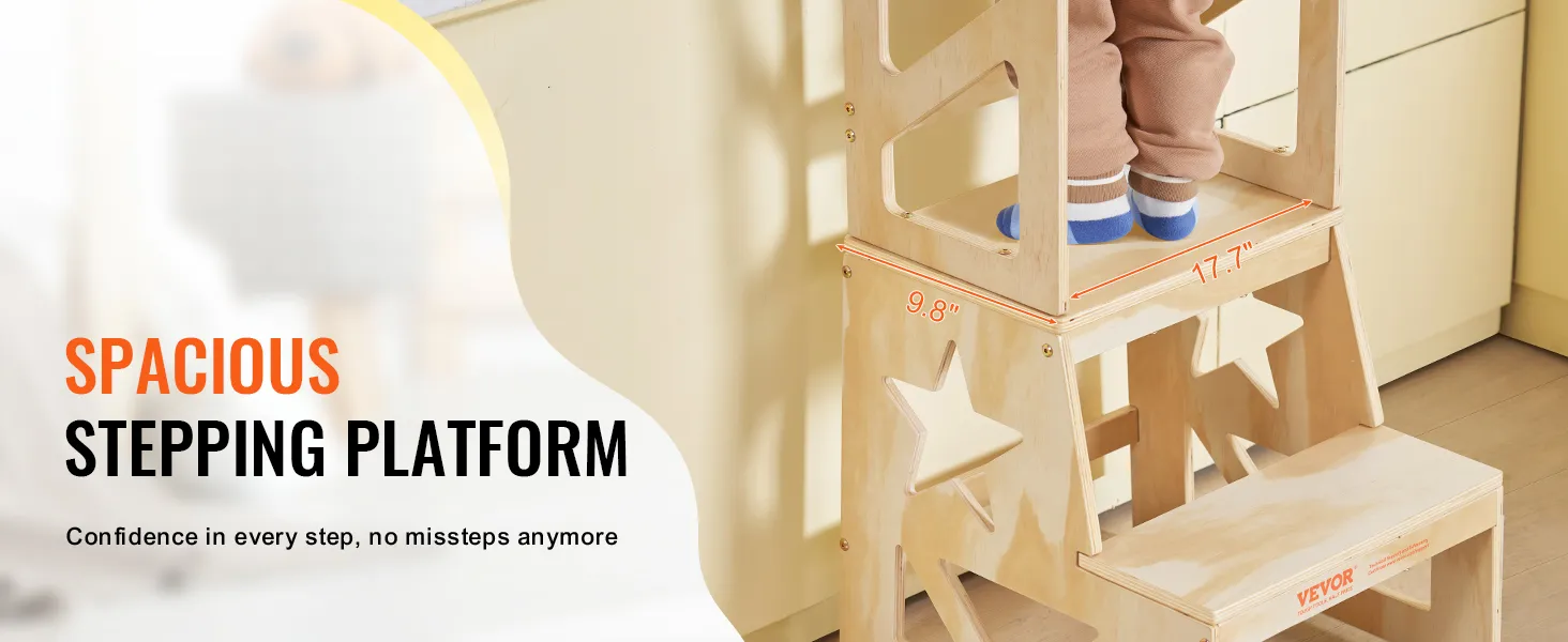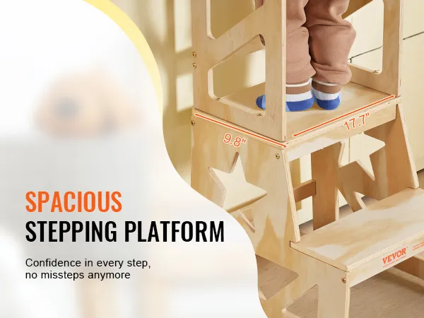 Zaprojektowany do kuchni, ten stołek może być używany w kilku pomieszczeniach. Jest idealny do łazienki, sypialni lub dowolnego miejsca, w którym Twoje dziecko potrzebuje wsparcia. Stołek jest wszechstronny i sprawia, że jest dla Ciebie niezwykle przydatny. Możesz go używać, aby pomóc dziecku zbliżyć się do zlewów, blatów, a nawet wysokich półek. Jego adaptowalność pozwala Twojemu maluchowi uczestniczyć w różnych czynnościach w domu, co czyni go naprawdę wszechstronnym narzędziem.