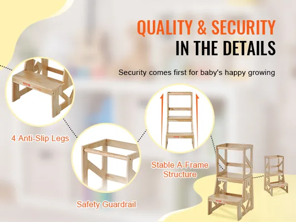 Posiada barierkę zabezpieczającą, która zapewnia bezpieczeństwo Twojemu dziecku, gdy stoi na stołku. Barierka zapobiega przypadkowym upadkom, zapewniając Ci spokój ducha. Ten stołek ma solidną konstrukcję i jest stabilny, nawet gdy Twoje dziecko się porusza. Funkcje bezpieczeństwa sprawiają, że jest to niezawodny wybór dla każdego gospodarstwa domowego z maluchami. Możesz zaufać temu stołkowi, że zapewni bezpieczeństwo Twojemu maluchowi, gdy będzie odkrywał i uczył się.