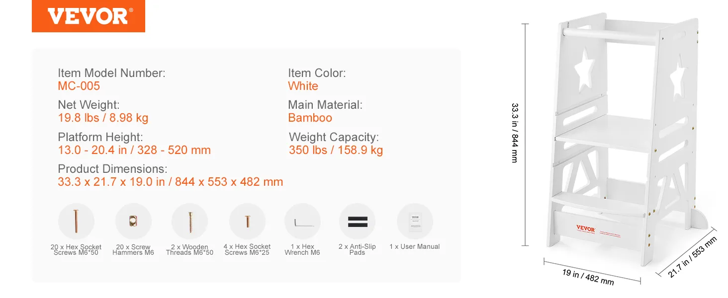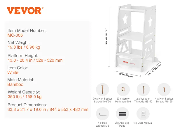 Ten stołek jest łatwy w montażu, z czytelną instrukcją, co sprawia, że proces jest prosty. Złożenie go zajmuje około 30 minut. Stołek może być używany jako podnóżek, gdy Twoje dziecko podrośnie. Górną część stołka można łatwo wyjąć z miejsca do przechowywania. Podnóżek VEVOR Tower Step Stool to doskonały dodatek do każdego domu, ponieważ konstrukcja siedziska umożliwia łatwe zdejmowanie, dzięki czemu jest odpowiedni na każdym etapie rozwoju dzieci. Jego wszechstronność oznacza, że jest to trwałe narzędzie do rozwoju Twojego dziecka. Łatwy montaż i dostosowująca się konstrukcja sprawiają, że ten podnóżek jest wszechstronnym wyborem dla rodzin.