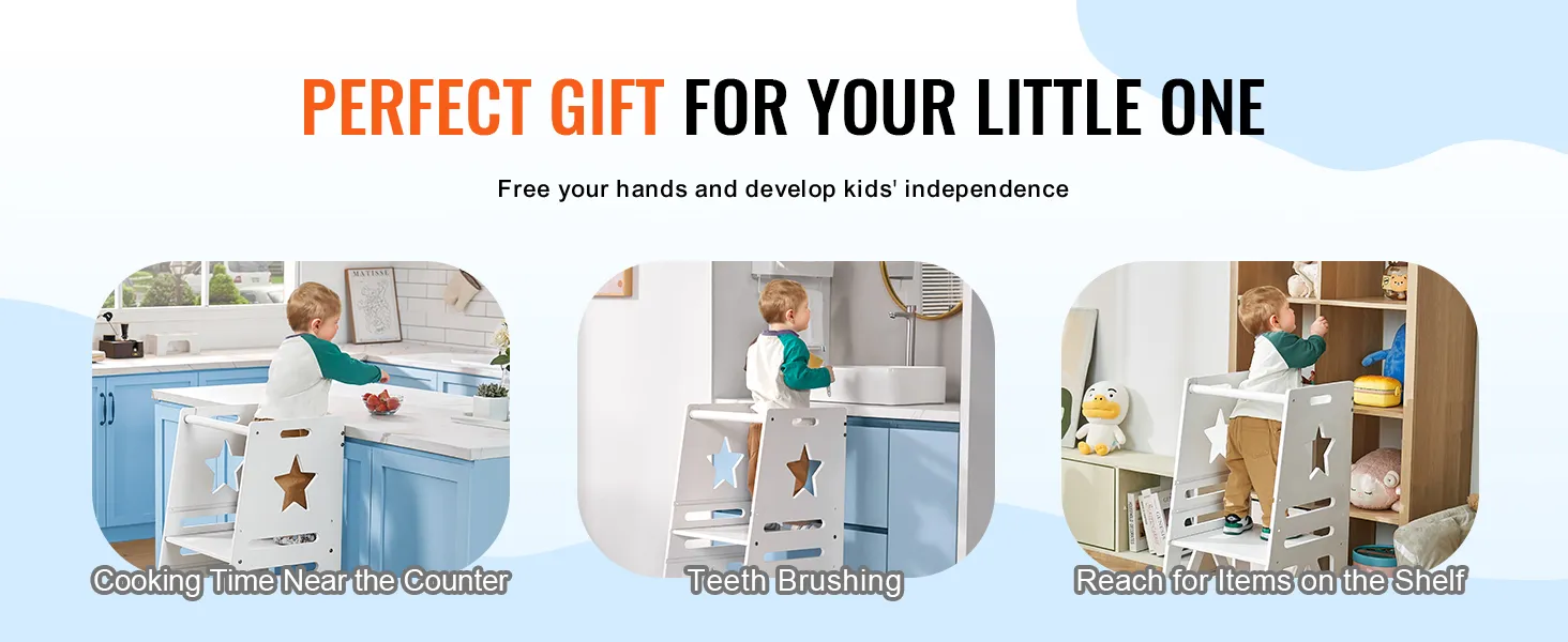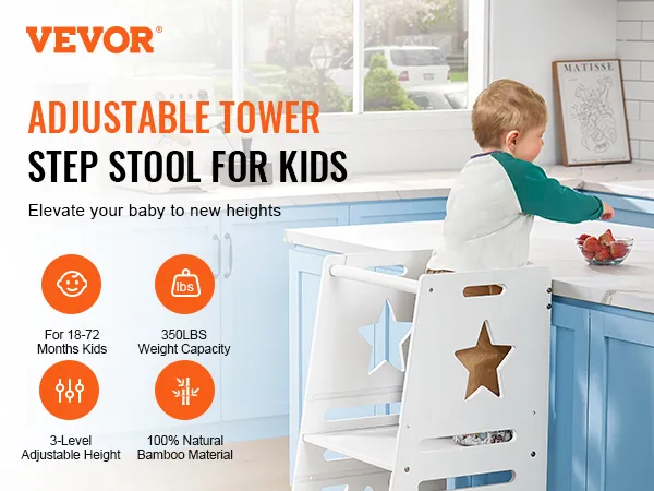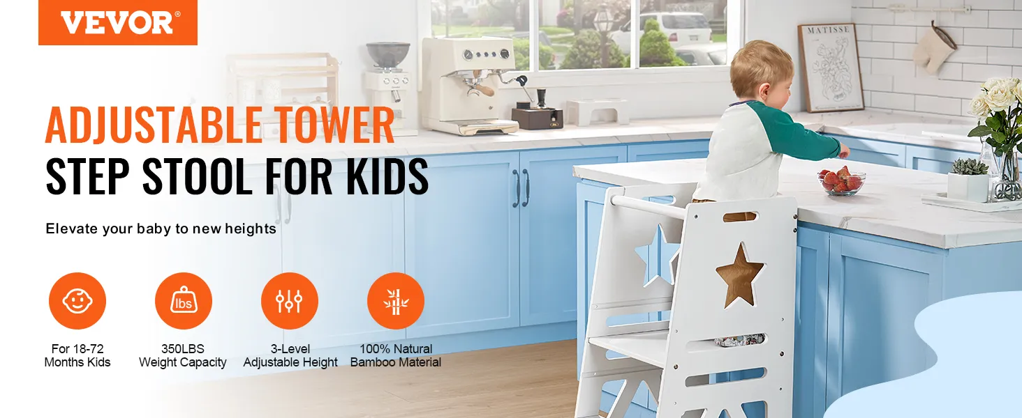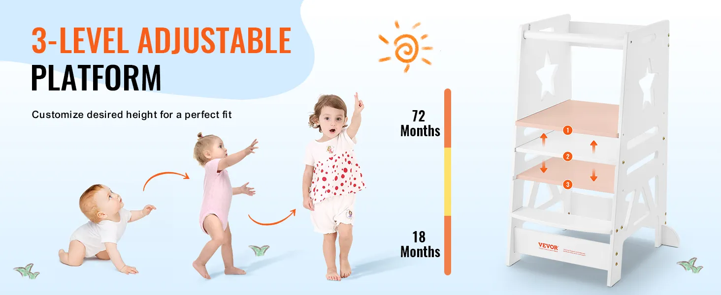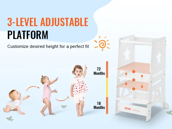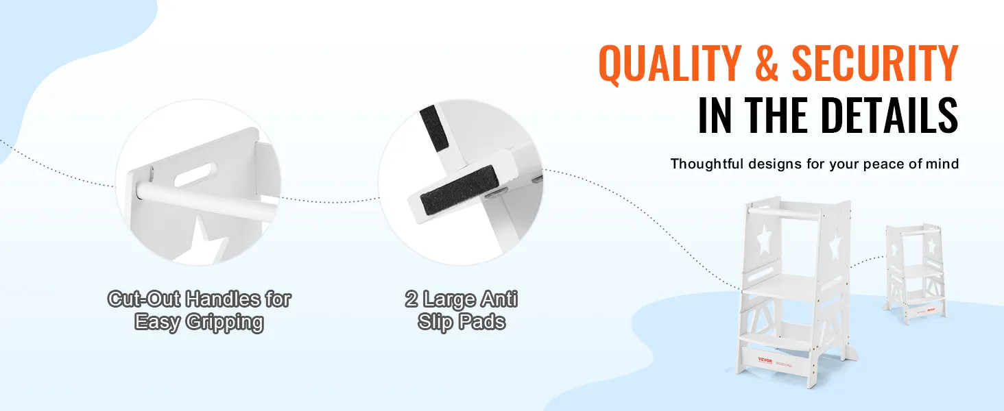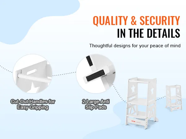 Podnóżek VEVOR Tower Step Stool ma regulowaną wysokość. Można go ustawić na trzech poziomach, w zakresie od 13,0 do 20,4 cala. Ta cecha sprawia, że jest odpowiedni do różnych aktywności i grup wiekowych. Można go używać do różnych aktywności, spełniając potrzeby Twojego dziecka. Niezależnie od tego, czy Twoje dziecko pomaga w kuchni, czy sięga po coś wysokiego, stołek można odpowiednio dostosować. Regulowane opcje wysokości ułatwiają dzieciom udział w różnych zadaniach. Ta elastyczność jest ważna, gdy dzieci rosną, a ich potrzeby się zmieniają. Te regulowane nóżki zapewniają, że stołek pozostaje użytecznym narzędziem przez wszystkie wczesne lata życia Twojego malucha. Dzięki regulowanym wysokościom stołek może pasować do różnych wzorców aktywności, co czyni go doskonałym dodatkiem do Twojego domu.