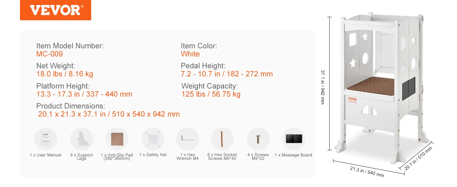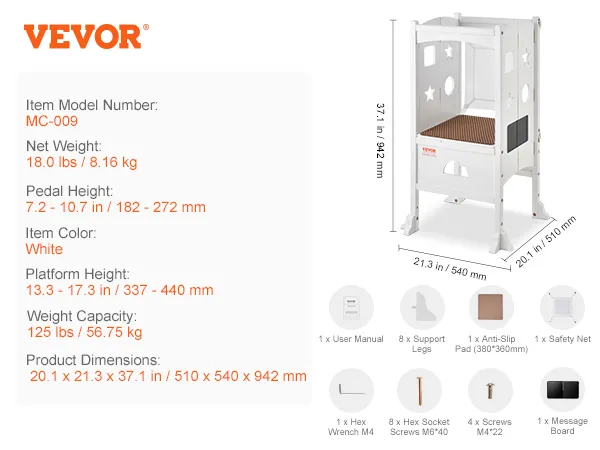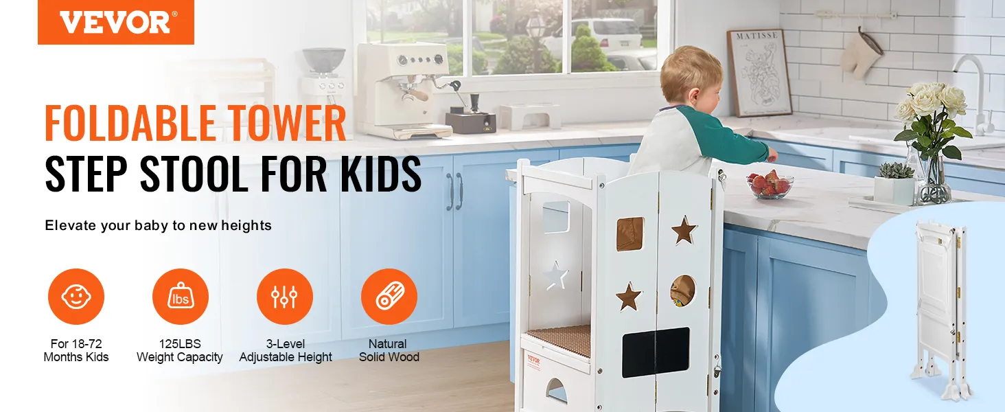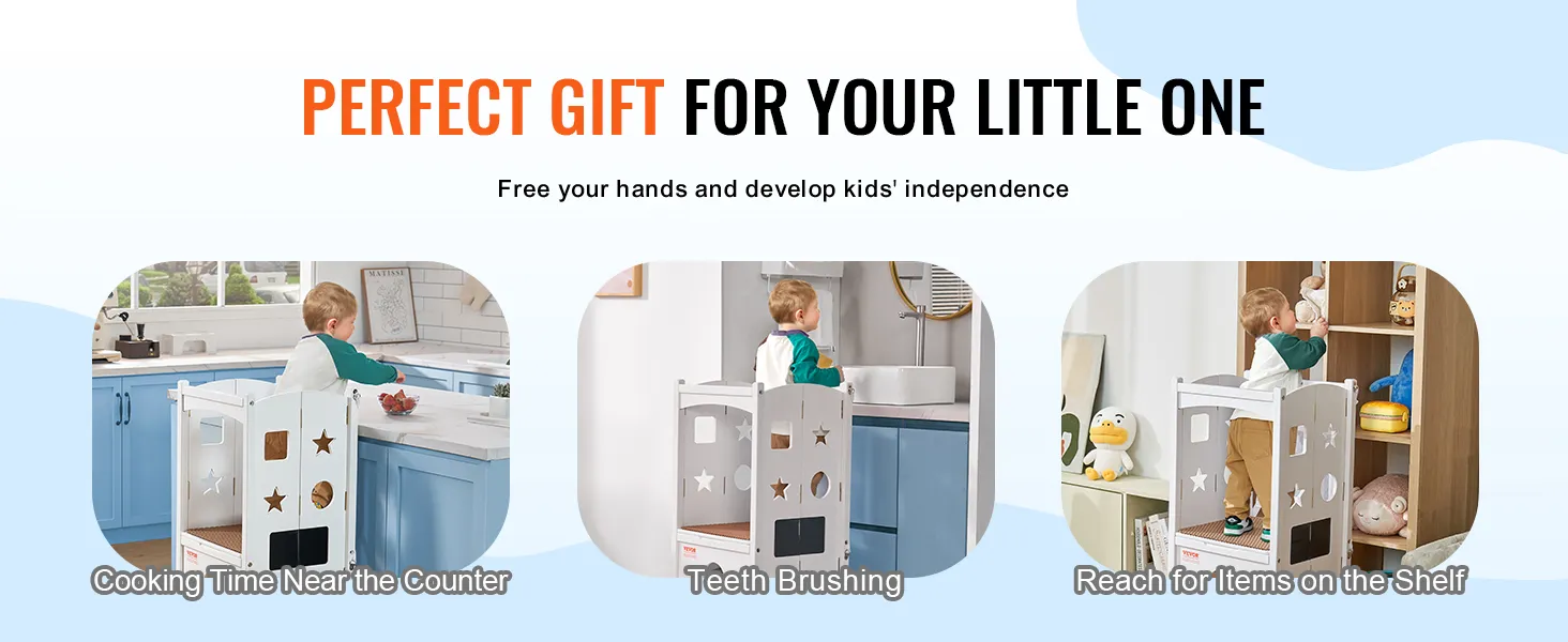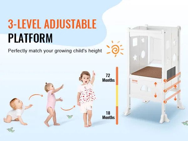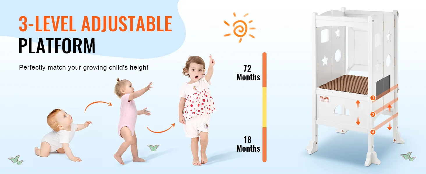Schodek VEVOR Tower Step Stool ma regulowaną wysokość. Ta funkcja zapewnia, że rośnie wraz z Twoim dzieckiem. Możesz ustawić wysokość, aby dopasować ją do jego potrzeb. Gdy dziecko podrośnie, możesz odpowiednio dostosować stołek. Dlatego jest to długotrwała inwestycja. Stołek będzie przydatny przez lata. Idealnie nadaje się do różnych aktywności i etapów dzieciństwa. Regulowana wysokość sprawia również, że jest wszechstronny dla rodzin z wieloma dziećmi. Jego elastyczność pozwala na korzystanie z niego przez dzieci w różnym wieku. Dzięki temu adaptowalność naszego stołka gwarantuje, że pozostaje on niezwykle pomocny. Zaprojektowaliśmy go tak, aby spełniał zmieniające się potrzeby dorastających dzieci.