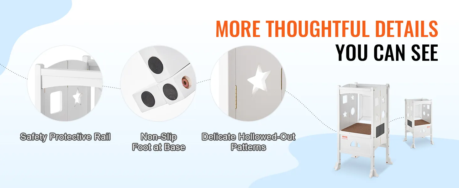 Stołek Tower Step VEVOR zawiera siatkę zabezpieczającą przed upadkami. Siatka dodaje dodatkową warstwę bezpieczeństwa. Dzięki temu Twoje dziecko może korzystać ze stołka pewnie. Szeroka podstawa zapewnia stabilność, zmniejszając ryzyko przewrócenia się. Jest zaprojektowany tak, aby był bezpieczny i niezawodny. Możesz zaufać, że zapewni bezpieczeństwo Twojemu dziecku podczas użytkowania. Funkcje bezpieczeństwa To świetny wybór dla rodziców. Zapewnia spokój ducha, podczas gdy Twoje małe dziecko odkrywa i uczy się. Funkcje bezpieczeństwa promują niezależność. Bezpieczna konstrukcja naszego stołka zachęca do niezależności.