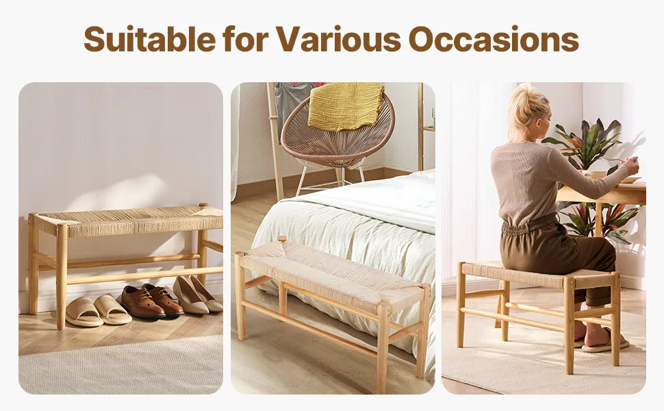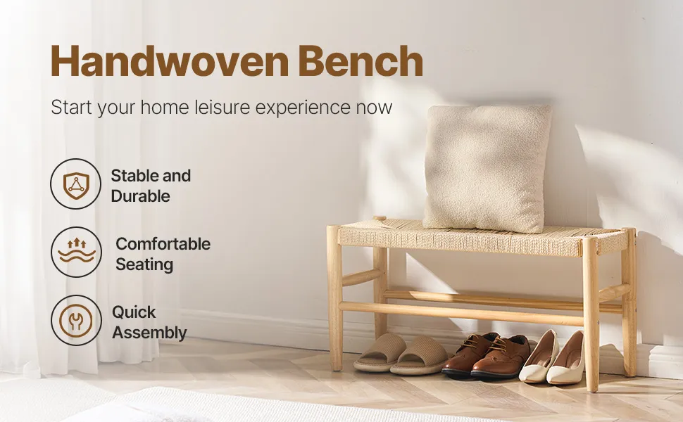 Styl tkany ręcznie: Ta ławka z rattanu, łącząca lite drewno i ręcznie tkaną linę, to stylowy element, który ozdobi każde wejście. Dzięki naturalnemu wyglądowi i rzemieślniczemu akcentowi, ławka ta będzie idealnym dodatkiem do Twojego domu, wnosząc ciepło i komfort do Twojego codziennego życia.