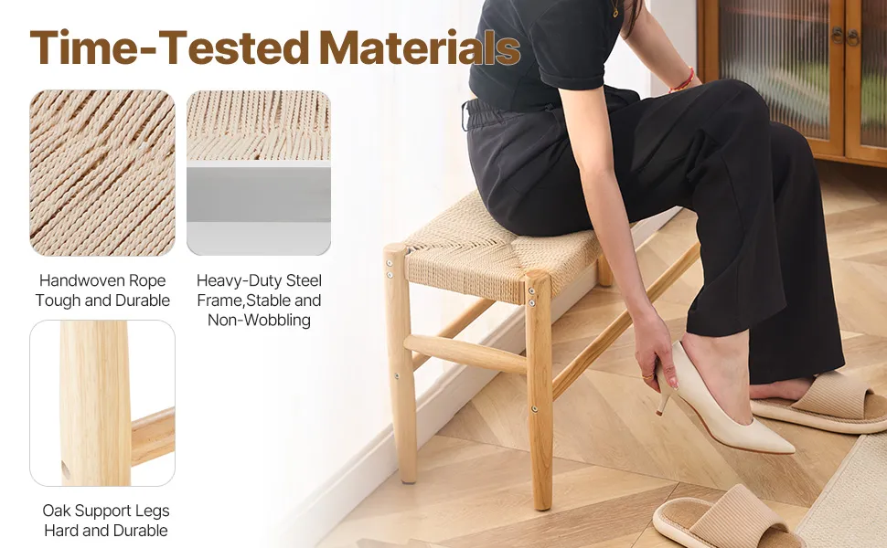 Jakość i stabilność: Ta rattanowa ławka do przedpokoju oferuje jakość i stabilność dzięki ręcznie plecionej powierzchni z liny, która zapobiega odkształcaniu się i zapewnia wygodę siedzenia przez wiele godzin. Zimą pozostaje chłodna, a latem przewiewna! Solidna stalowa rama i polerowane nogi z naturalnego dębu sprawiają, że ławka jest nie tylko piękna, ale i trwała.