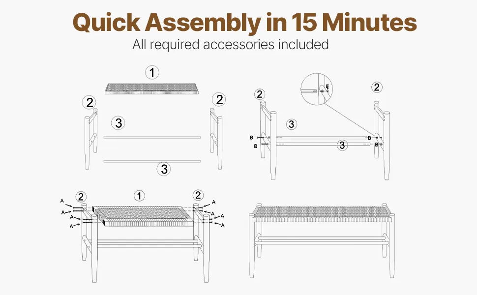 Ta drewniana ławka jest dostarczana ze wszystkimi niezbędnymi częściami i przejrzystą instrukcją, dzięki czemu można ją zmontować w około 15 minut.