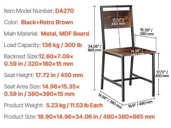 Krzesło do jadalni w stylu rustykalnym VEVOR (opakowanie 2 szt.) Drewniane krzesło boczne (nośność 136 kg) do stołów jadalnych, oszczędzające miejsce krzesło do stołu kuchennego z metalową ramą i oparciem, rustykalny brąz i czerń