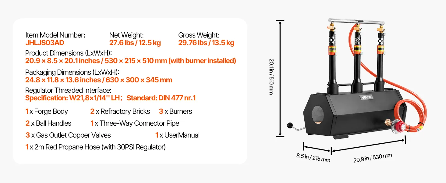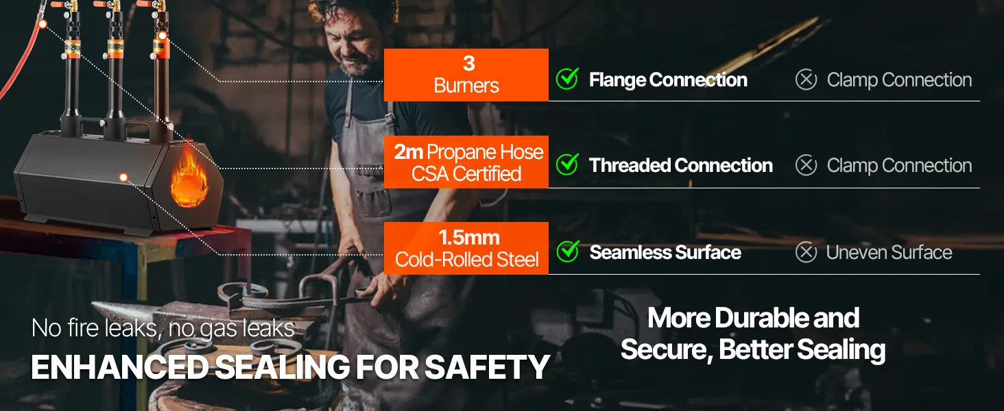 Lepsze wykonanie i bezpieczeństwo: korpus kuźni propanowej wykonany jest z 1,5 mm stali walcowanej na zimno, malowanej proszkowo, z ulepszonymi palnikami i gwintowanym wężem propanowym z certyfikatem CSA, co gwarantuje długą żywotność i bezpieczeństwo bez wycieków.