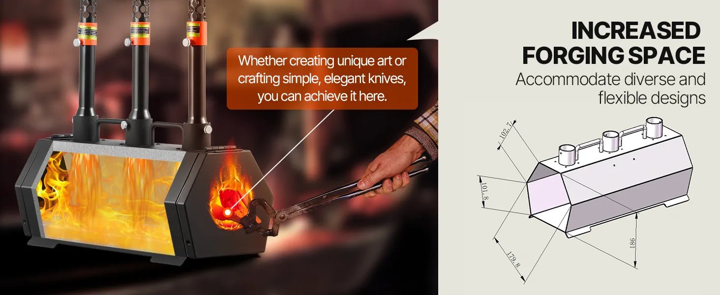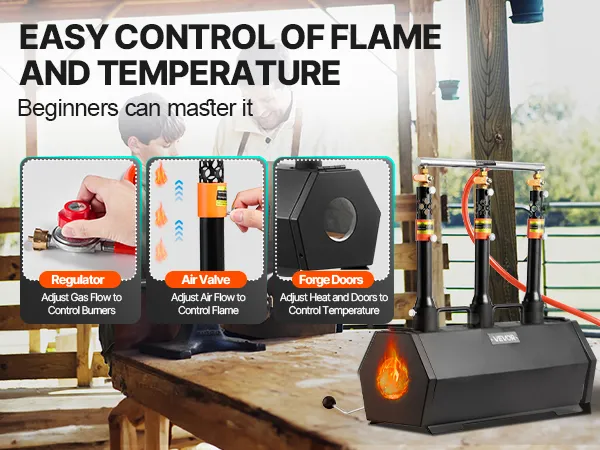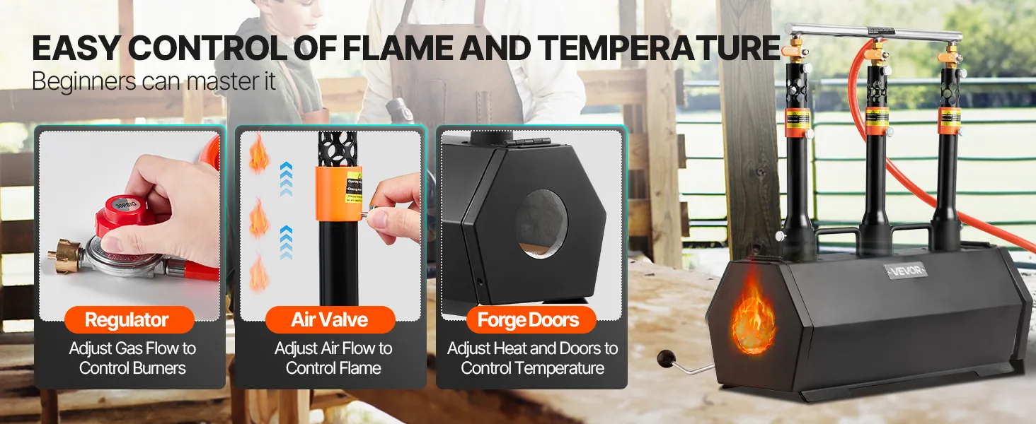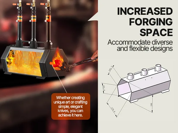 Łatwa obsługa i kontrola temperatury: Nasze kuźnie gazowe do kowalstwa wyposażone są w 3 palniki z regulowanymi zaworami. Zawór powietrza i regulacja przepływu propanu umożliwiają precyzyjną regulację mocy cieplnej różnych metali, w tym złota, miedzi, srebra, stali, aluminium i innych.