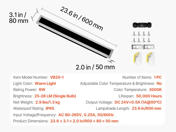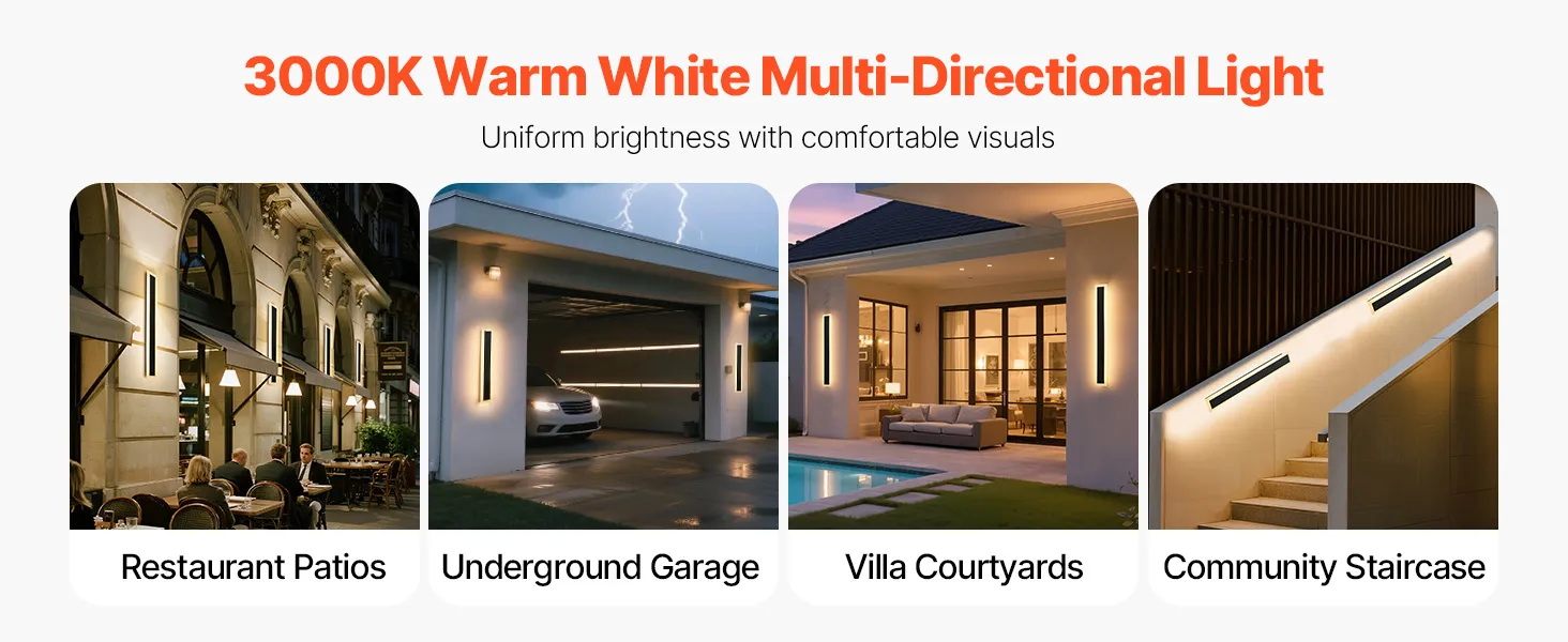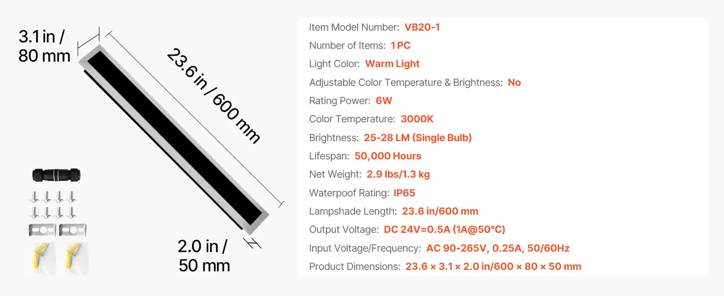 VEVOR Zewnętrzna lampa ścienna, 23,6-calowy pasek nowoczesnej zewnętrznej lampy ściennej, 3000 K ciepła biel, IP65 wodoodporna, nierdzewna, oświetlenie zewnętrzne do montażu na ścianie tarasu, do domu, na werandę, do garażu