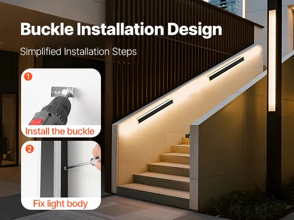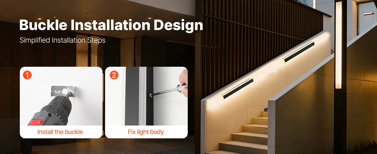 Ta zewnętrzna lampa ścienna posiada prefabrykowane kanały kablowe i montaż za pomocą klamry. Najpierw należy poprowadzić kable przez kanały, a następnie zabezpieczyć korpus lampy za pomocą klamry. Ten dwuetapowy proces upraszcza skomplikowane operacje i nadaje się do różnych instalacji zewnętrznych.