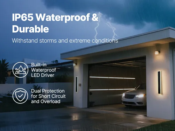 Dzięki klasie wodoodporności IP65, nasza zewnętrzna lampa ścienna jest wyjątkowo wodoszczelna i hermetyczna, co czyni ją idealną do pracy w ekstremalnych warunkach pogodowych, takich jak burze i silne wiatry. Wbudowany, wodoodporny sterownik LED posiada zabezpieczenie przed zwarciem i przeciążeniem, gwarantując niezawodne działanie.