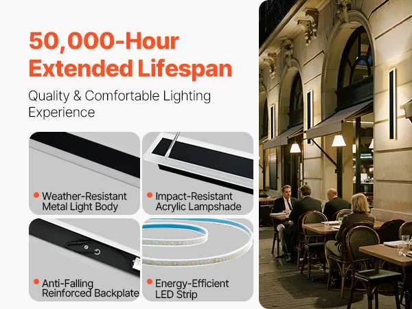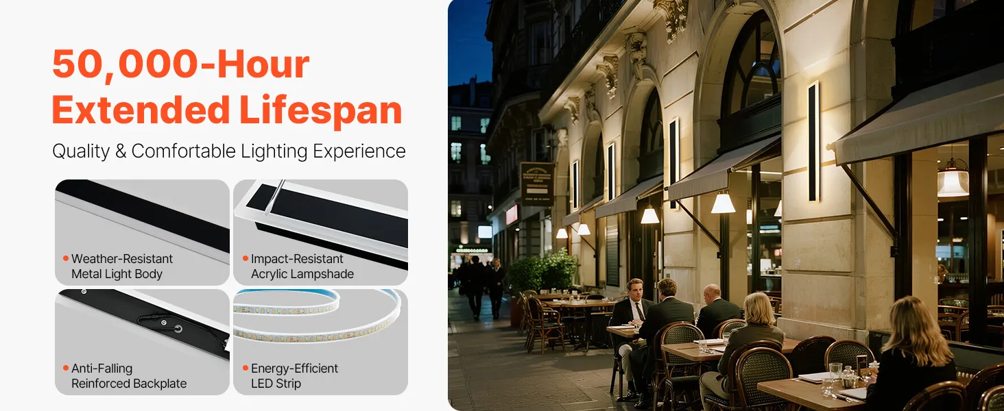 Taśma świetlna LED: Ta zewnętrzna lampa ścienna zapewnia strumień świetlny o natężeniu 25-28 lumenów na żarówkę i jednolitym strumieniu światła. Energooszczędna taśma LED zużywa mniej energii i oferuje żywotność 50 000 godzin, co potencjalnie obniża koszty firmy.