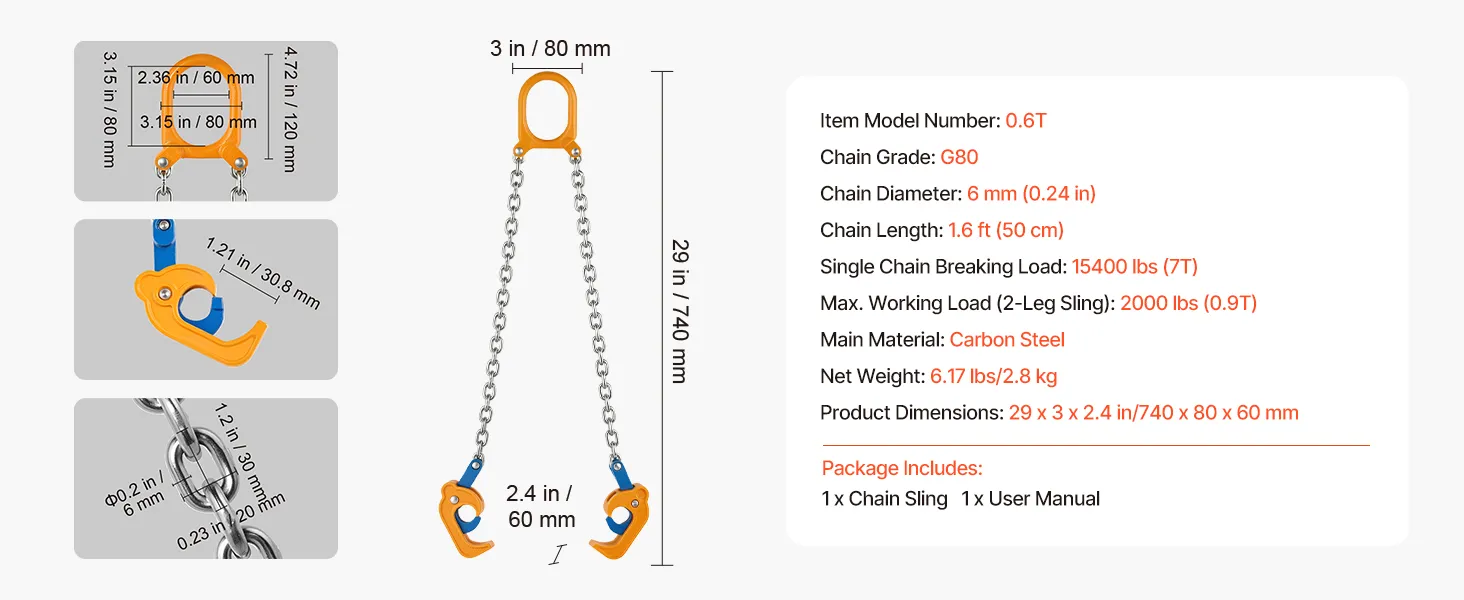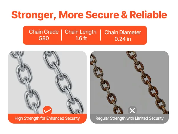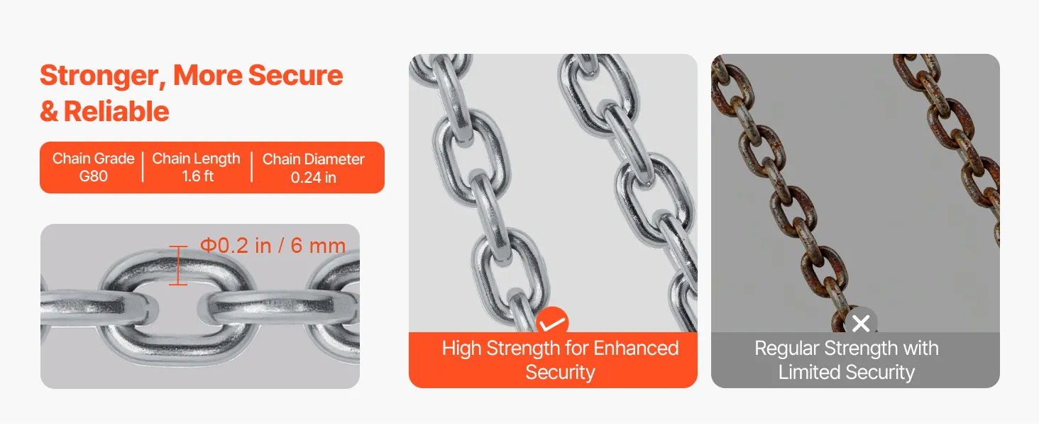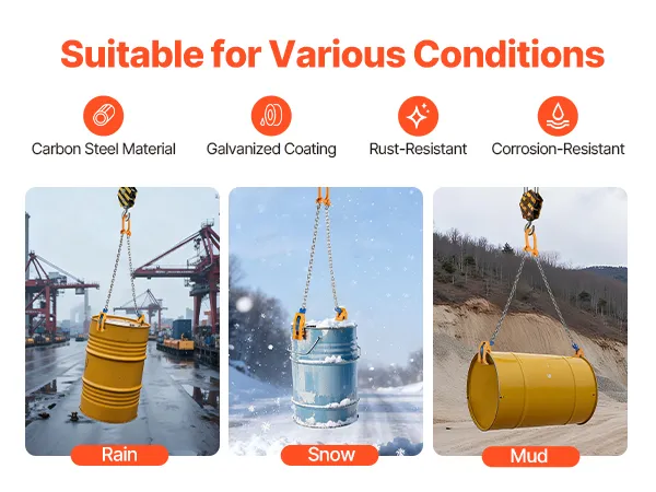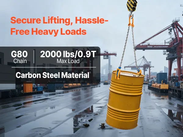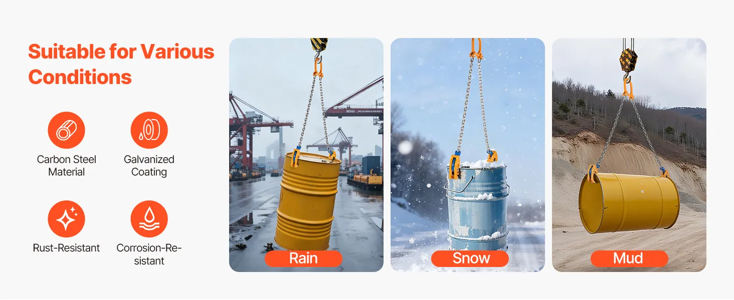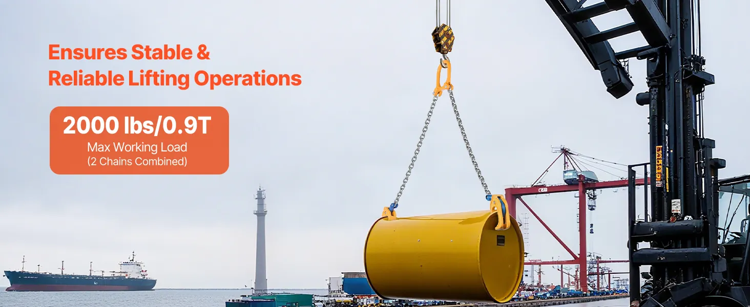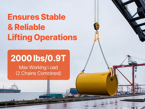 2200 funtów Wysoki udźwig: przy maksymalnym obciążeniu roboczym wynoszącym 0,9 tony ten wytrzymały łańcuch do podnoszenia beczek oferuje niezawodną siłę podnoszenia w zastosowaniach przemysłowych i budowlanych.