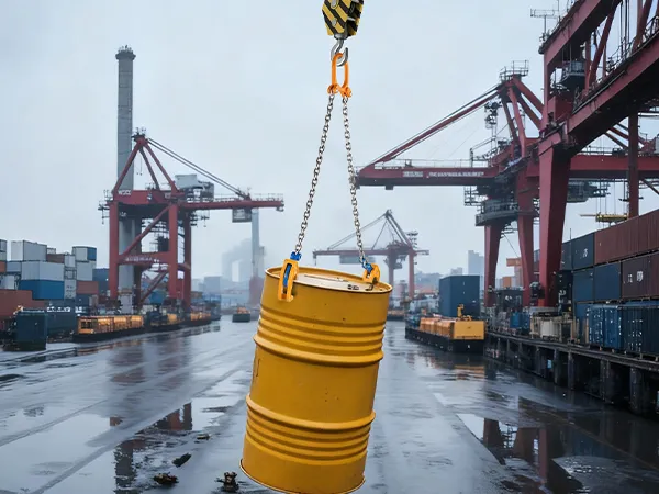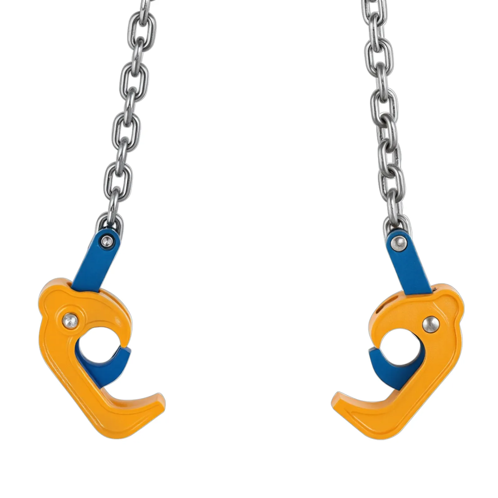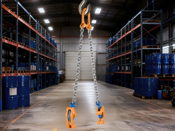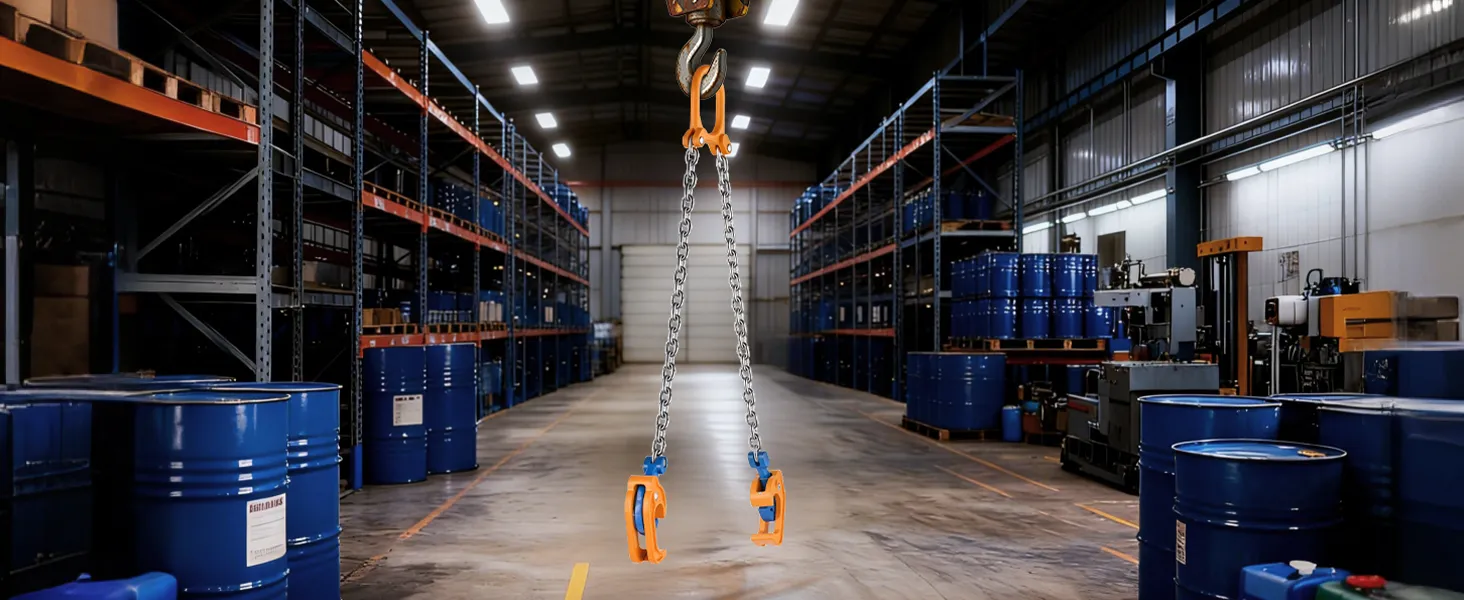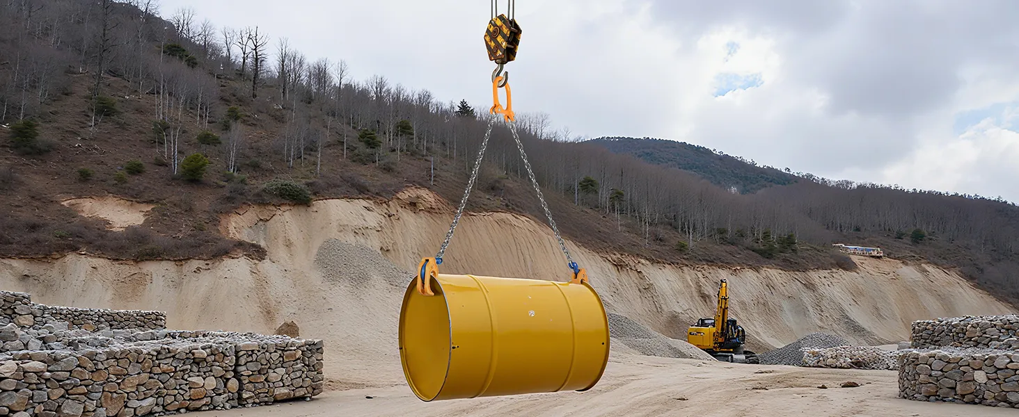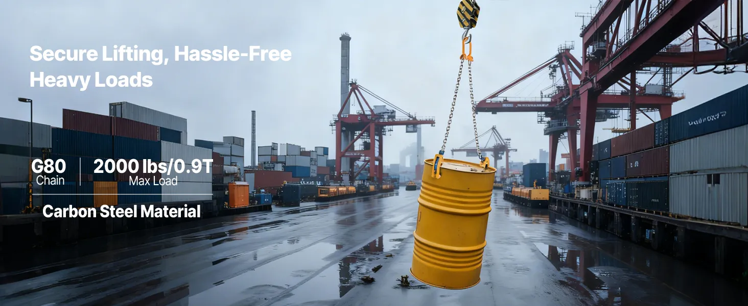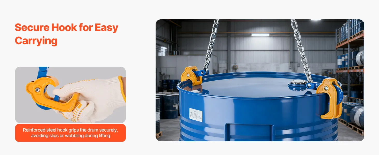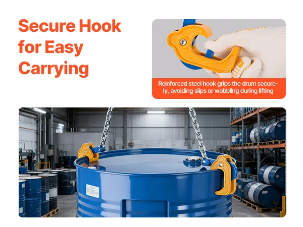 Haki bezpieczeństwa z mechanizmem blokującym: Wyposażony we wzmocnione haki z mechanizmem blokującym, podnośnik łańcuchowy do beczek z olejem pewnie trzyma beczki, nie uszkadzając ich, zapewniając mocny chwyt i zapobiegając przypadkowemu zwolnieniu, co zwiększa bezpieczeństwo operacji podnoszenia.