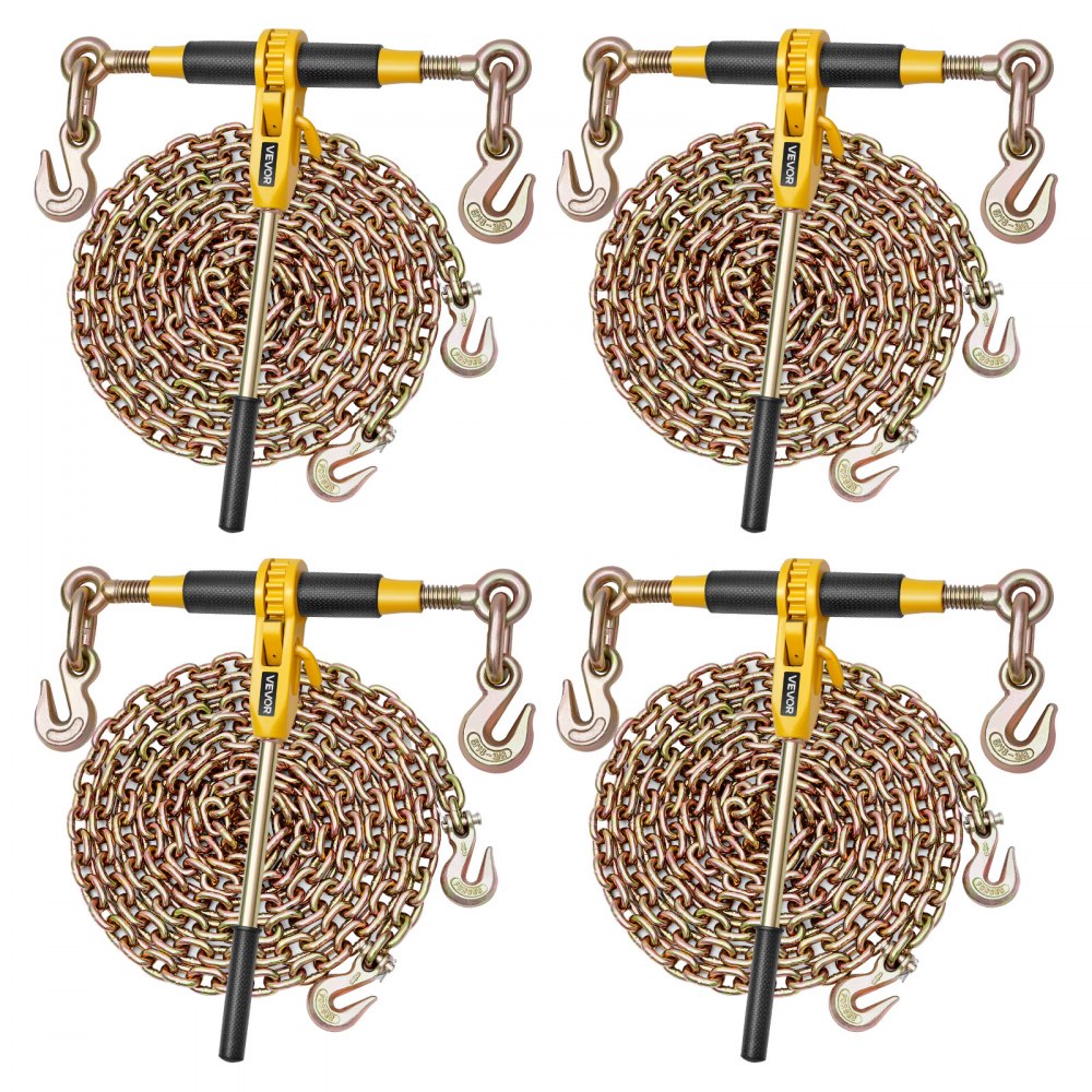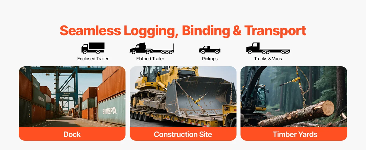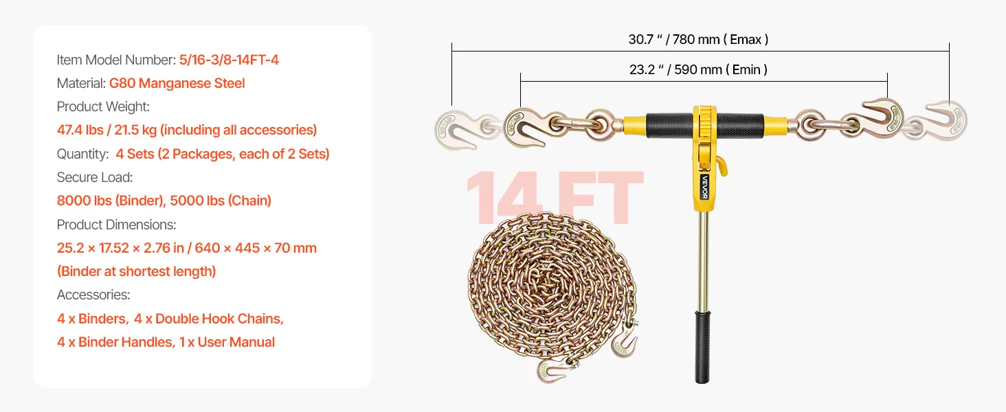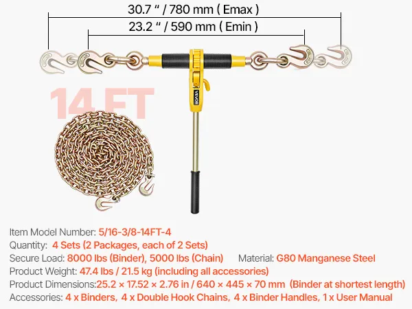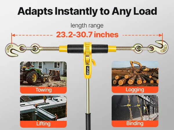 Kompatybilność i uniwersalność: Napinacz zapadkowy jest wyposażony w łańcuch G80 o długości 3,9 m (12,8 stopy) i średnicy 8 mm, odpowiedni do łańcuchów o średnicy od około 8 mm do 9,5 mm (od 5/16 do 3/8 cala). Regulowany rozstaw haków (59–78 cm) pasuje do ciężarówek, dźwigów i pickupów, idealnie sprawdzając się przy zabezpieczaniu drewna, sprzętu i wielu innych zastosowań.