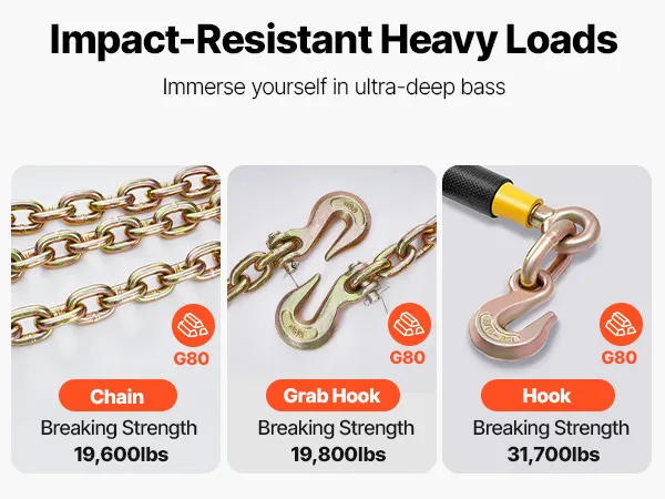 P: Czy łańcuch pęknie podczas awaryjnego hamowania? Czy może zabezpieczyć mój ciężki sprzęt? A: Bezpieczne obciążenie robocze: 3628 kg. Wytrzymałość na zerwanie sięga 14378 kg – pochłania uderzenia, jest odporny na odkształcenia.