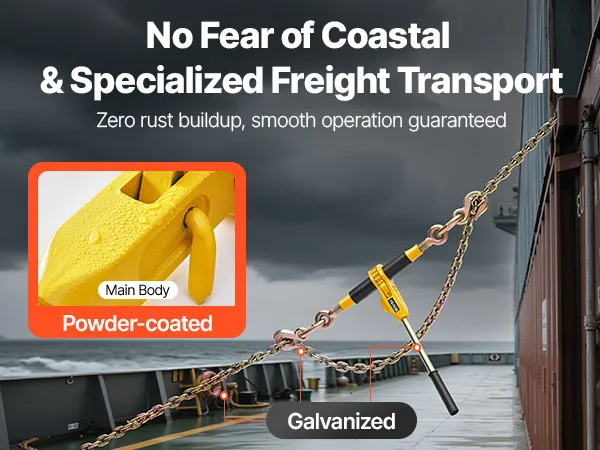 Kompleksowa ochrona przed rdzą: Dzięki ocynkowaniu lub wytrzymałej powłoce natryskowej, to urządzenie zabezpieczające ładunek z grzechotką jest odporne na korozję, zapewniając długotrwałą wydajność nawet w wymagających warunkach, takich jak obszary przybrzeżne i strefy niebezpieczne. To chroni Twoją inwestycję.