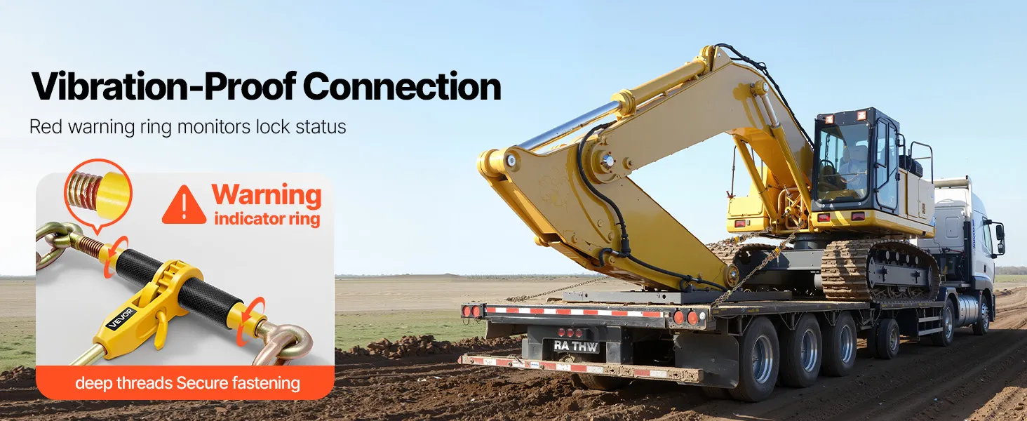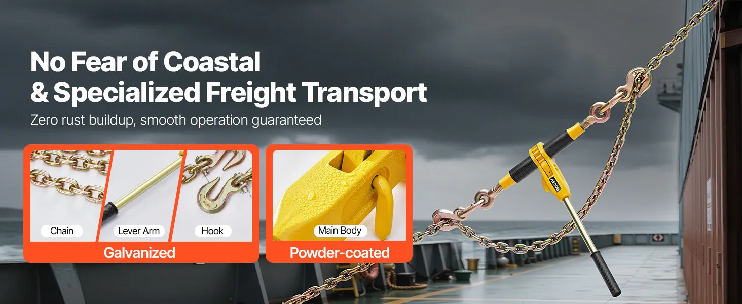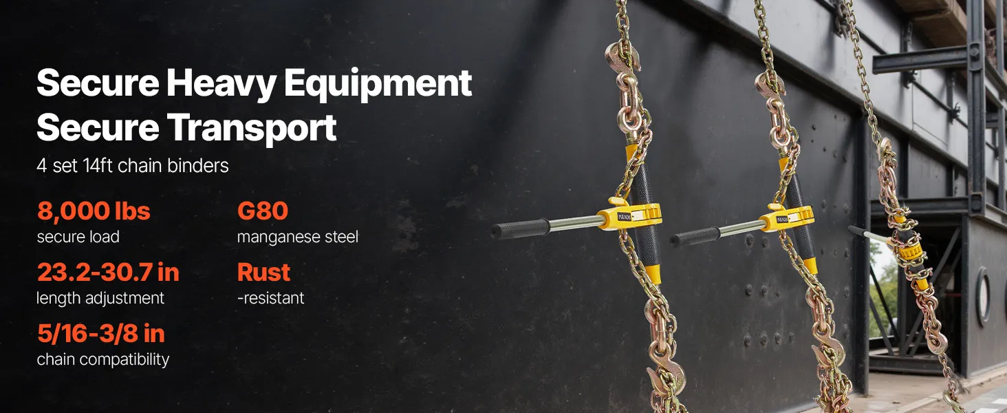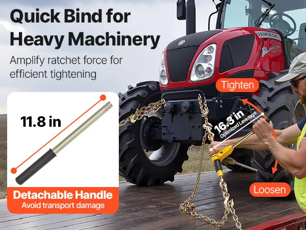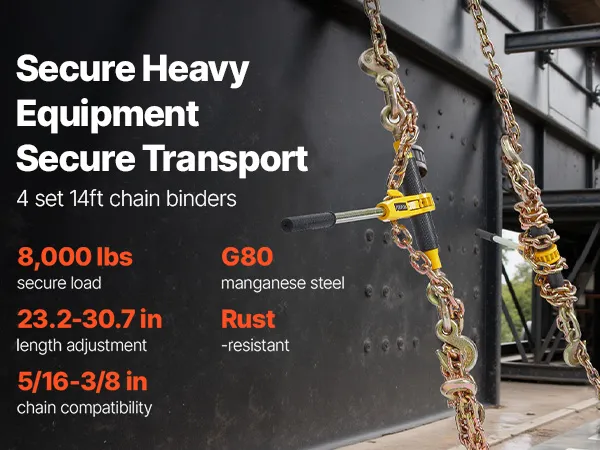 Nasz całkowicie stalowy napinacz łańcucha wytrzymuje obciążenia do około 3628 kg (8000 funtów) i idealnie nadaje się do transportu przemysłowego. Wyposażony jest w łańcuch G80 o długości około 3,9 m (12,8 stopy), co rozwiązuje problemy z kompatybilnością i wagą konwencjonalnych pasów mocujących.