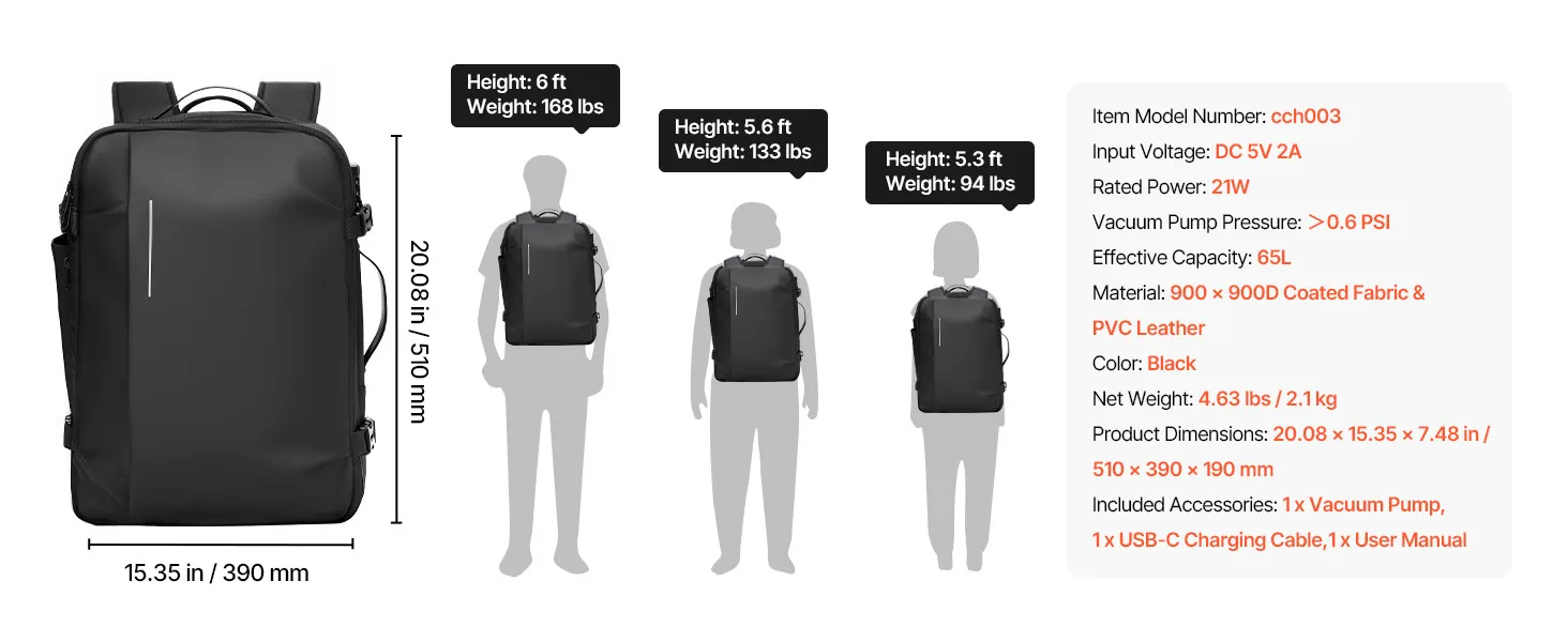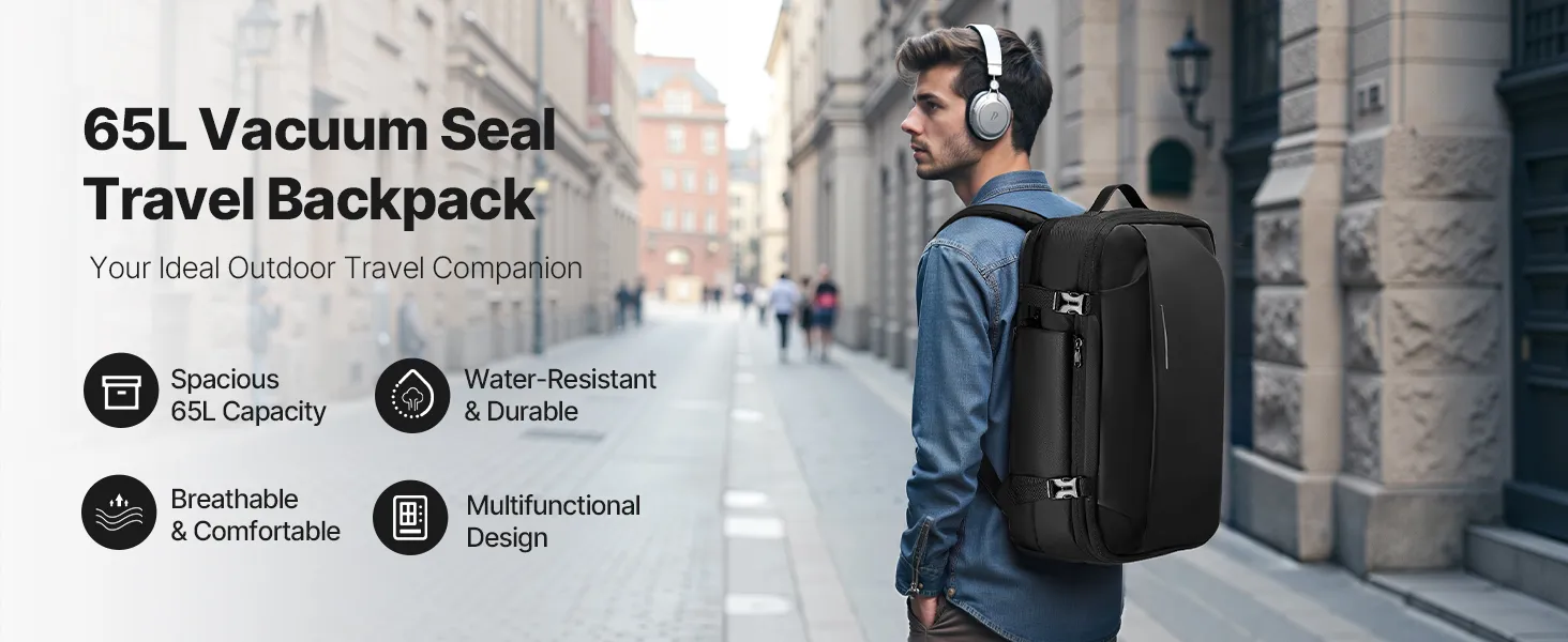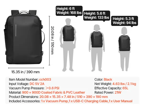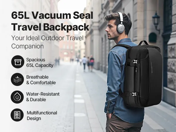 Plecak próżniowy VEVOR, 65 l, rozszerzalny plecak podróżny z kompresją próżniową i pompką, zamek zatwierdzony przez TSA, port ładowania USB, wodoodporny bagaż podręczny, dla firm, czarny