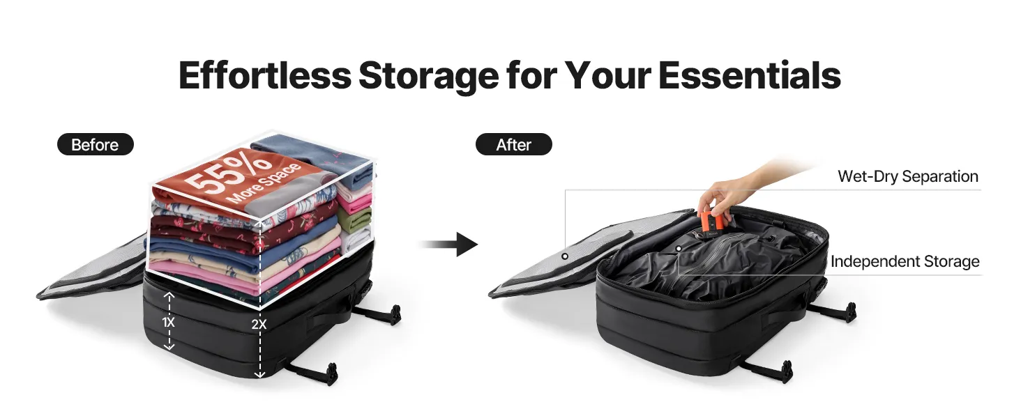 Ten plecak podróżny z zamknięciem próżniowym idealnie nadaje się do przechowywania ubrań, butów, kosmetyków do pielęgnacji skóry, kremów z filtrem, elektroniki i innych rzeczy. Przegrody na rzeczy suche i mokre zapewniają czystość i porządek.