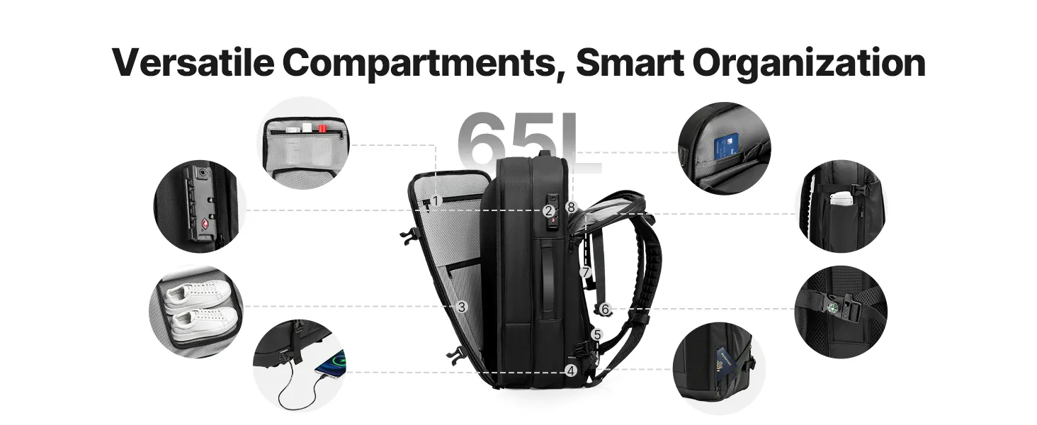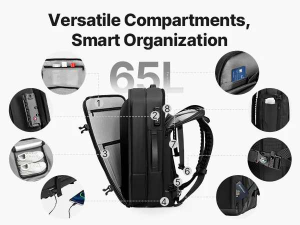 Bezproblemowa kompresja próżniowa: Wyposażony w miniaturową pompkę próżniową i warstwę rozprężną o szerokości 4,5 cm, ten plecak podróżny z funkcją próżni bez trudu kompresuje nieporęczne ubrania. Pojemność wzrasta do 65 litrów – idealny na długie wędrówki, podróże zagraniczne lub dłuższe wyjazdy służbowe.