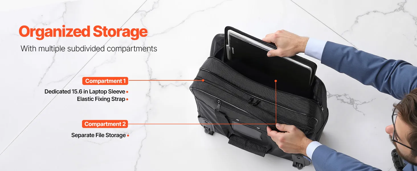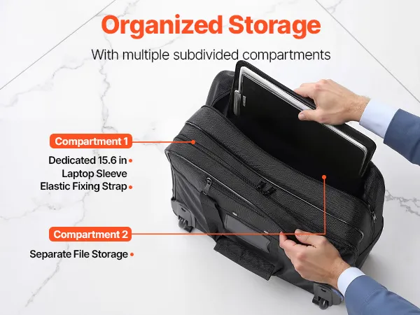 Zorganizowane przechowywanie, łatwy dostęp: Ta aktówka na kółkach ma wiele przegródek, które pozwolą Ci utrzymać wszystko w porządku. Główna komora oferuje bezpieczne miejsce na laptopy o przekątnej do 39,6 cm (15,6 cala), natomiast druga komora jest idealna do przechowywania dokumentów, teczek i materiałów dydaktycznych. Przednia kieszeń zapewnia łatwy dostęp do mniejszych przedmiotów, takich jak długopisy, notatniki i wizytówki
