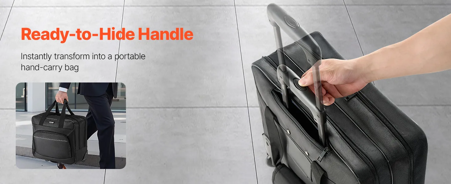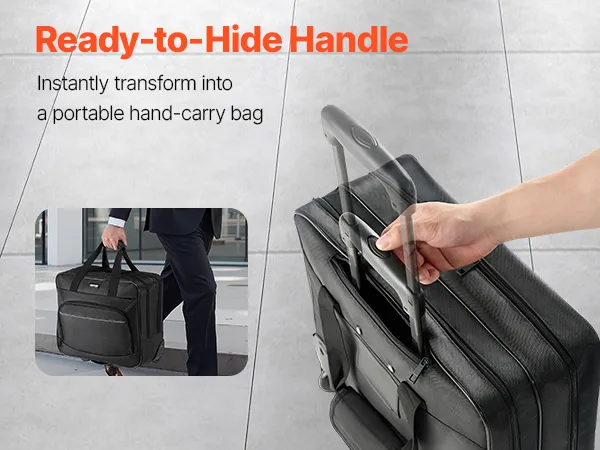 Regulowany, wygodny uchwyt: Ta torba biurowa na kółkach wyposażona jest w teleskopowy uchwyt o 4 regulowanych wysokościach, dzięki czemu łatwo dopasowuje się do Twojej postawy. Niezależnie od tego, czy stoisz, chodzisz czy siedzisz, zapewnia maksymalny komfort i kontrolę