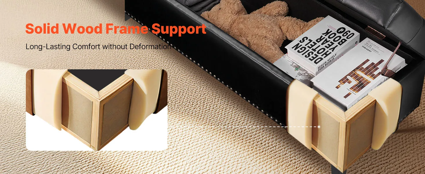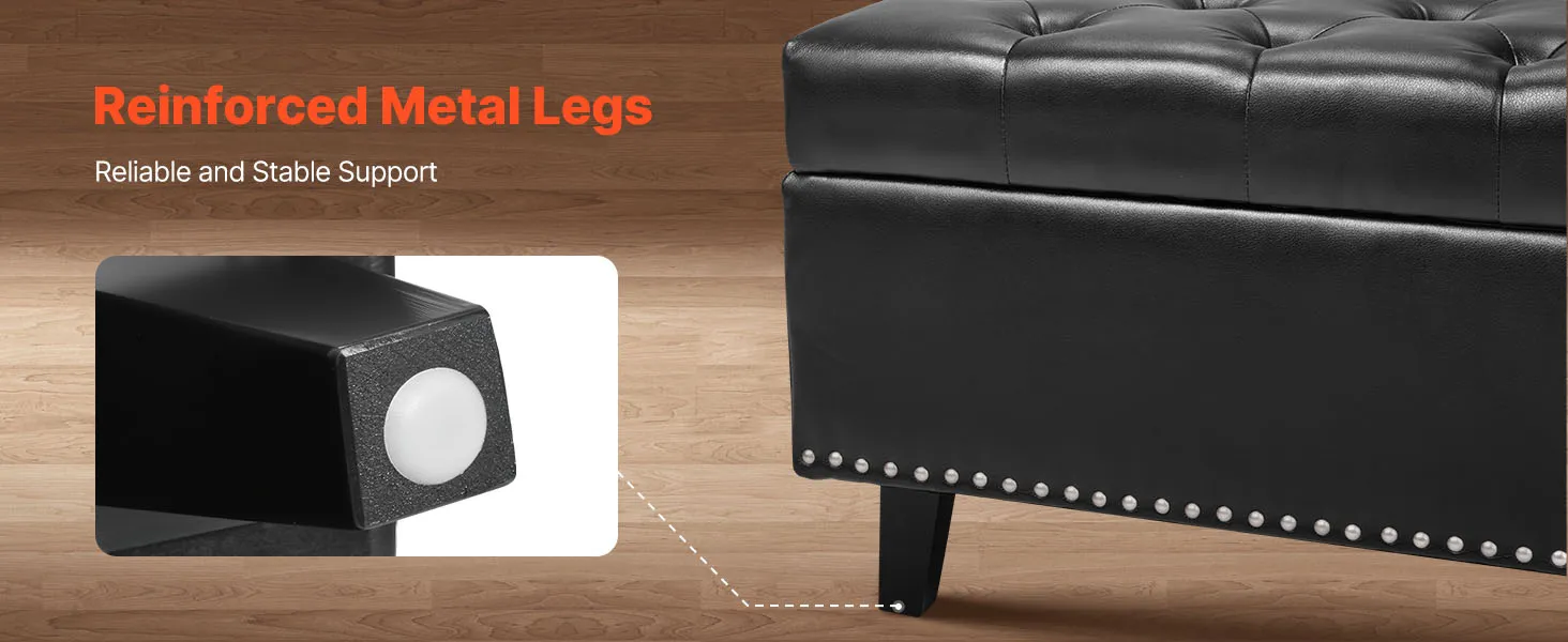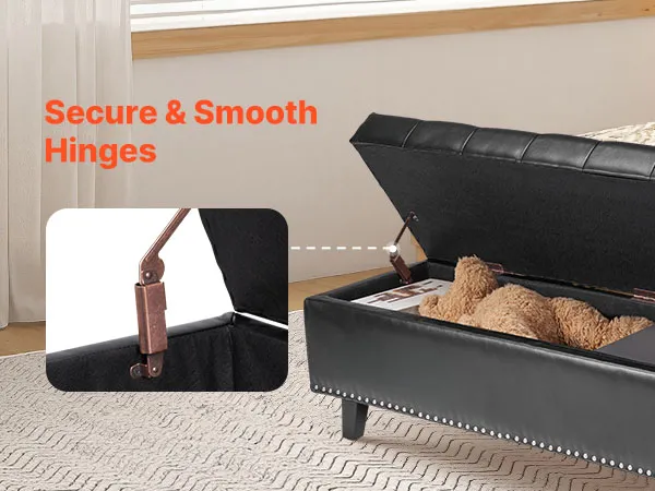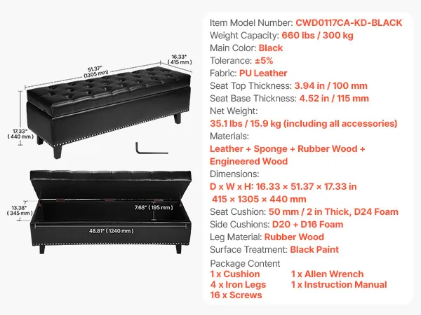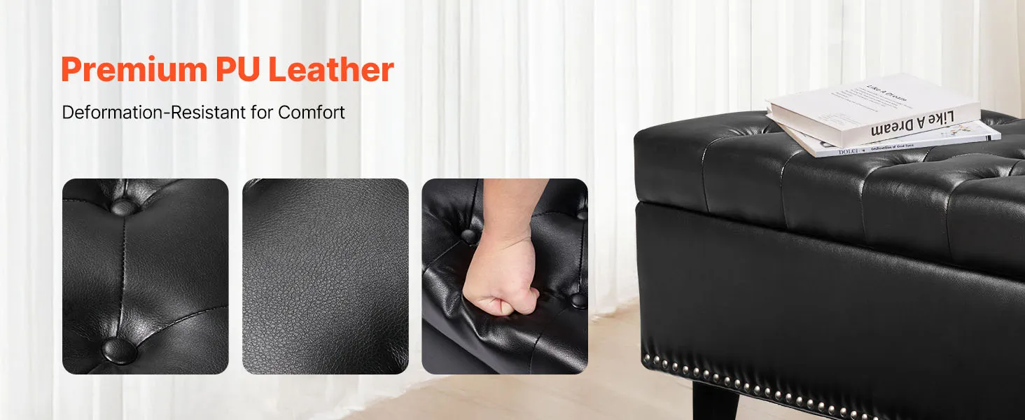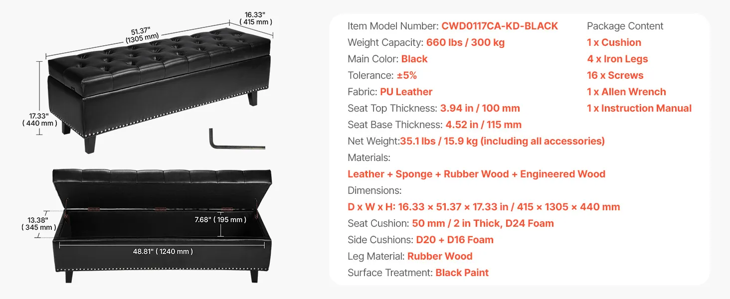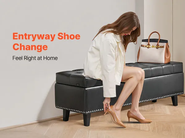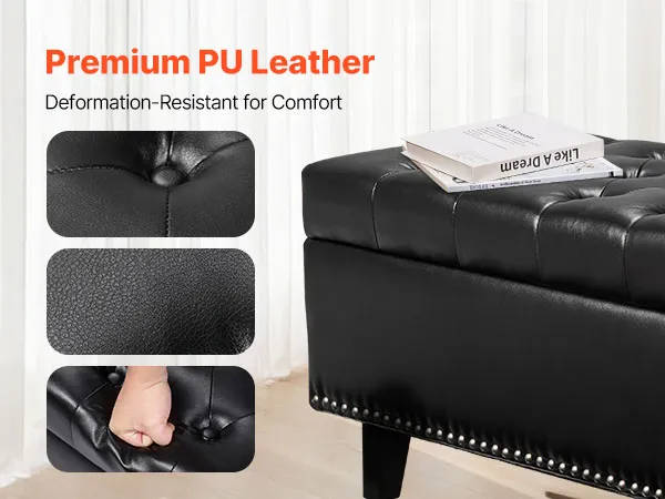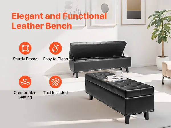 Wzmocnione podparcie: Ta skórzana ławka ze schowkiem oferuje mocne i trwałe podparcie dzięki solidnym nogom z drewna kauczukowego i solidnej ramie z drewna. Udźwig do 300 kg (660 funtów). Zaprojektowana do codziennego użytku, bez chwiania się i zapadania. Wymiary ławki: 415 x 1305 x 440 mm (16,33 x 51,37 x 17,33 cala).