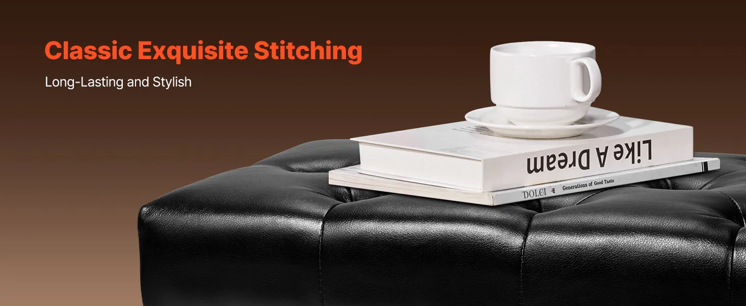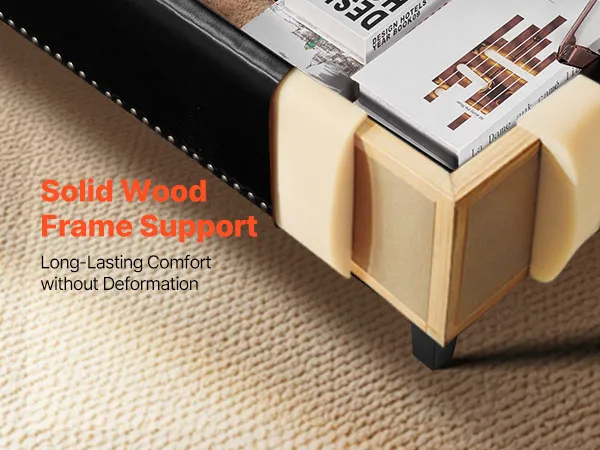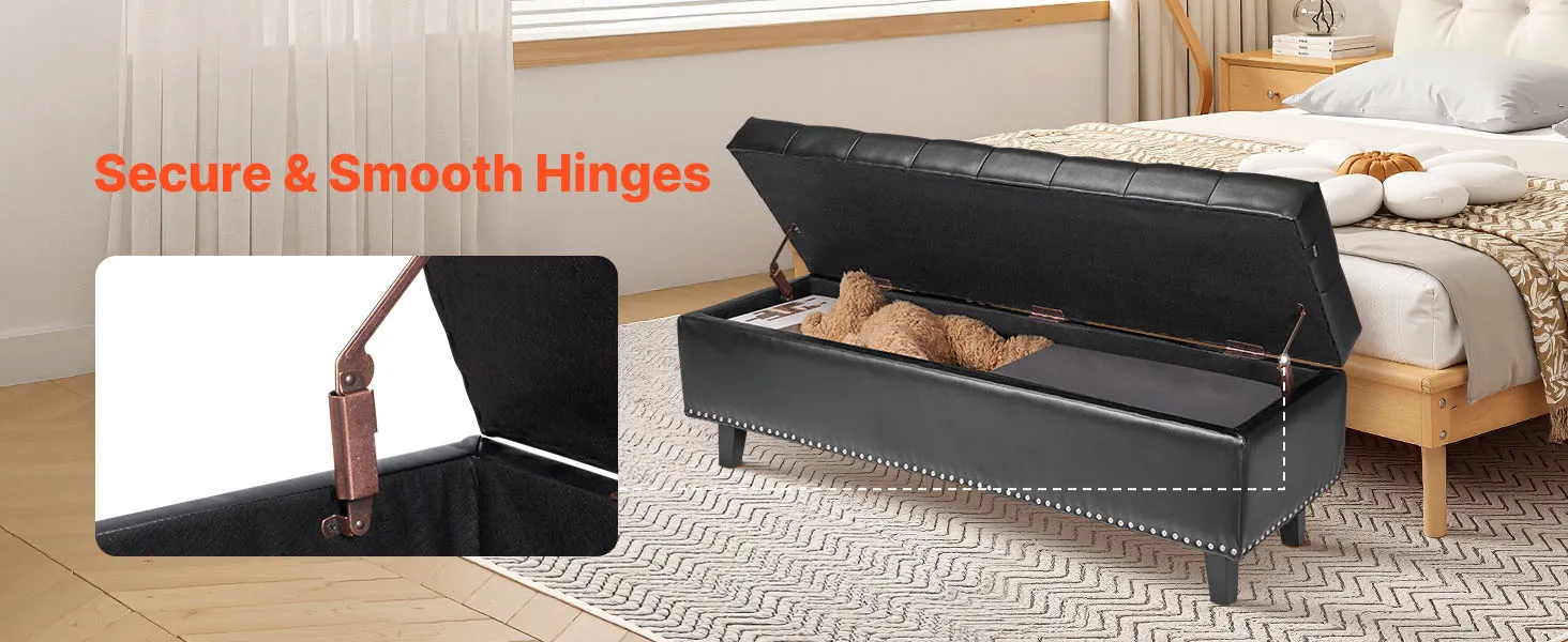 Gładka skóra PU: Wysokiej jakości skóra PU o jedwabistej fakturze i wyrafinowanych przeszyciach. Wodoodporna i łatwa w czyszczeniu, idealna do zapracowanych gospodarstw domowych. Nasza ławka z pojemnikiem do łóżka doda Twojej sypialni nowoczesnego, wyrafinowanego akcentu.