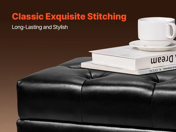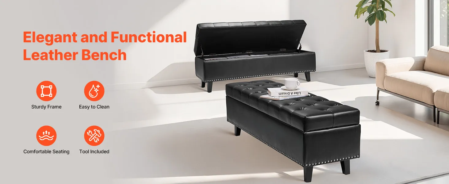 Ławka pufowa VEVOR (415 x 1305 x 440 mm) wykonana ze skóry PU z drewnianymi nogami, miejscem do przechowywania i przeszyciami, nowoczesna ławka na buty o udźwigu 300 kg, ławka do łóżka, ławka do sypialni i salonu, czarna