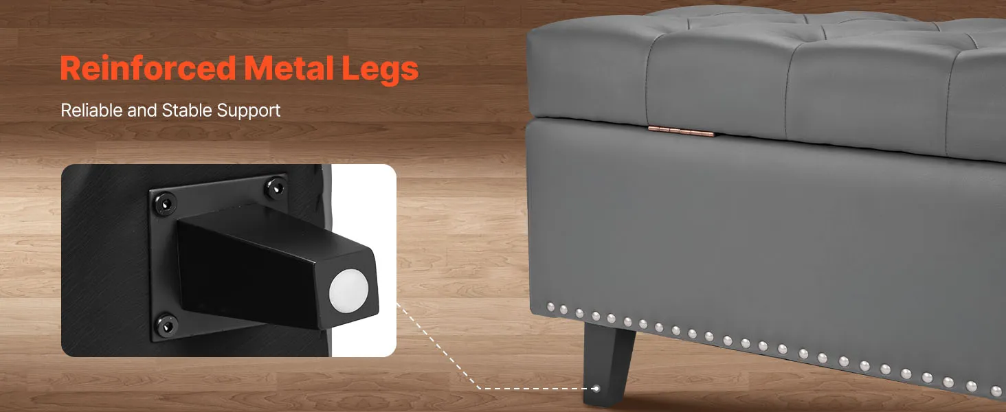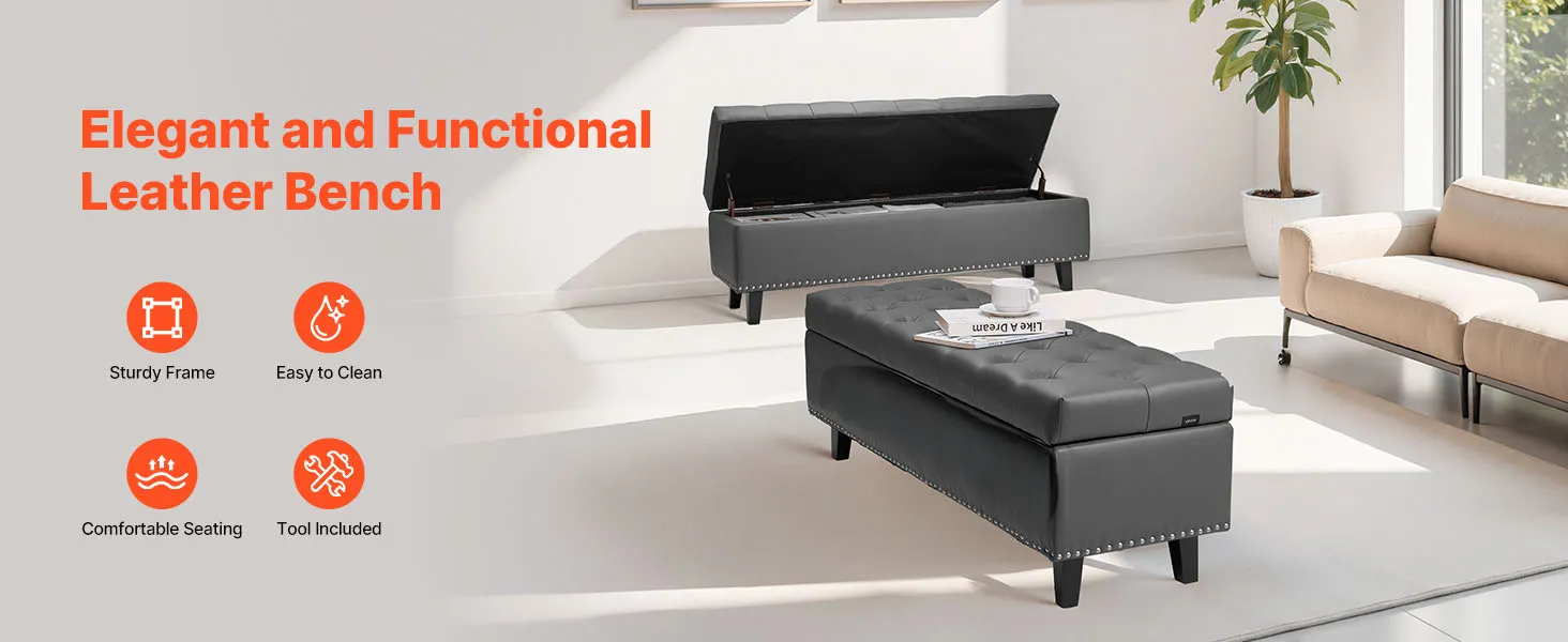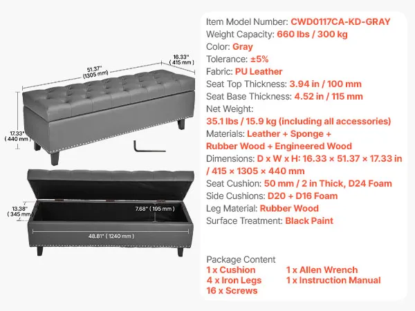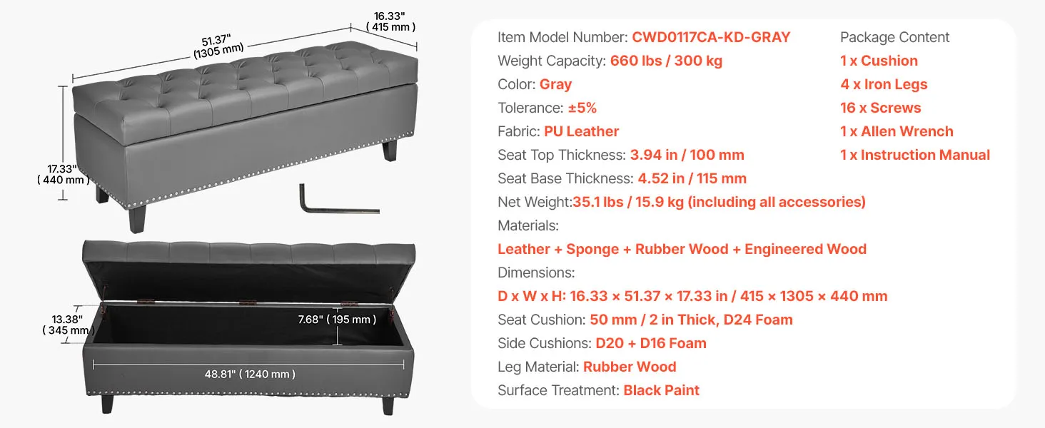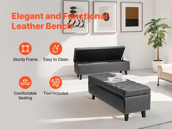 Wzmocnione podparcie: Ta skórzana ławka ze schowkiem oferuje mocne i trwałe podparcie dzięki solidnym nogom z drewna kauczukowego i solidnej ramie z drewna. Udźwig do 300 kg (660 funtów). Zaprojektowana do codziennego użytku, bez chwiania się i zapadania. Wymiary ławki: 415 x 1305 x 440 mm (16,33 x 51,37 x 17,33 cala).