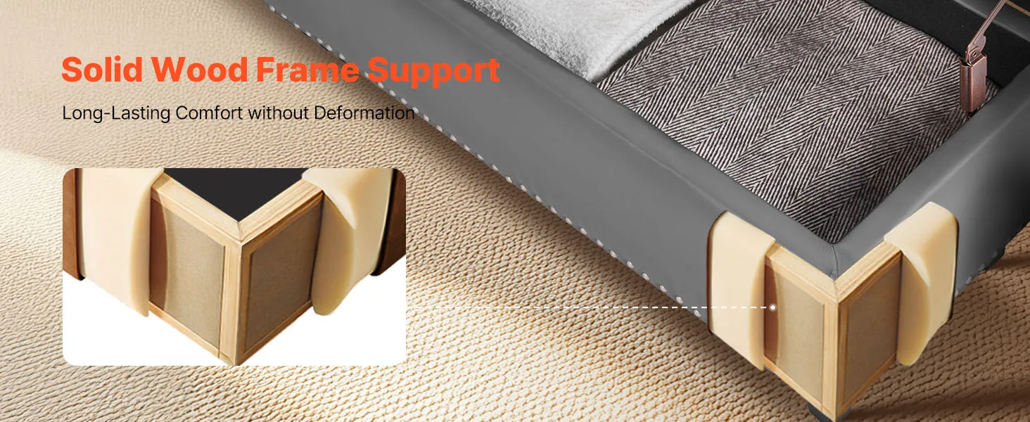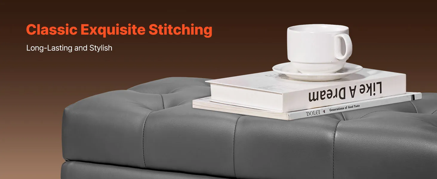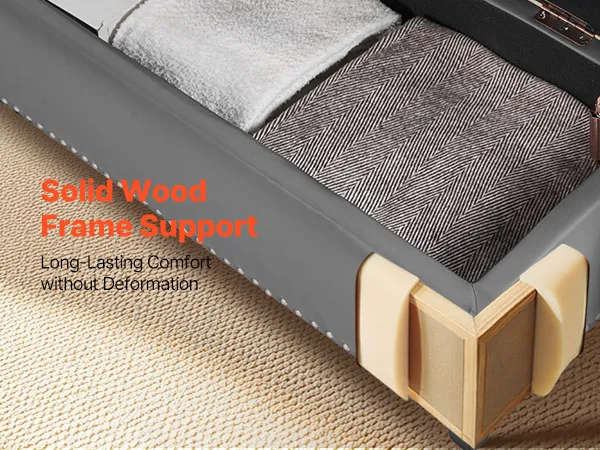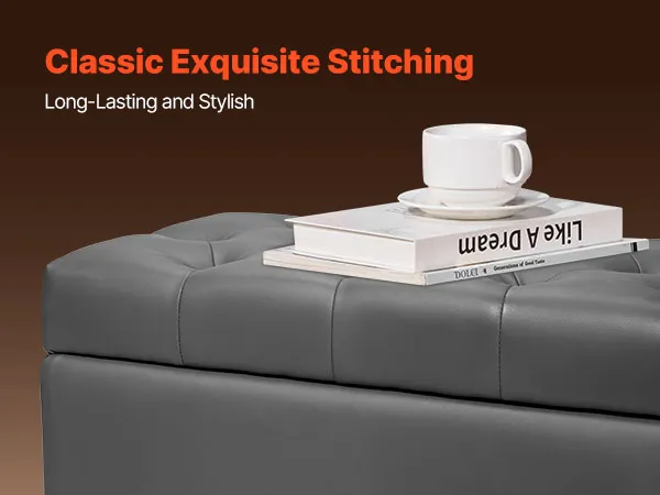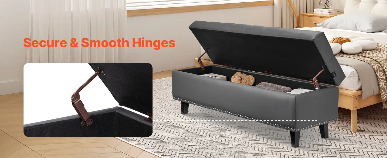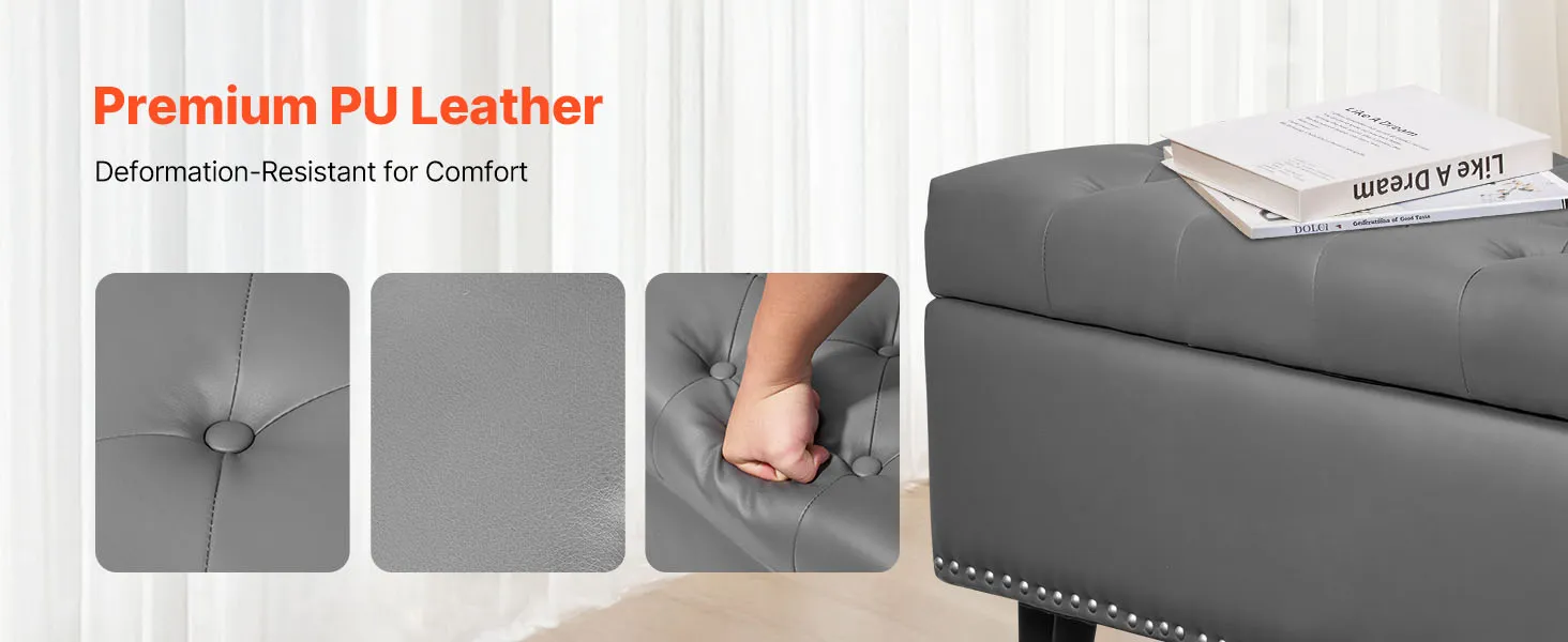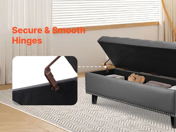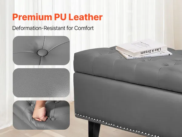 Gładka skóra PU: Wysokiej jakości skóra PU o jedwabistej fakturze i wyrafinowanych przeszyciach. Wodoodporna i łatwa w czyszczeniu, idealna do zapracowanych gospodarstw domowych. Nasza ławka z pojemnikiem do łóżka doda Twojej sypialni nowoczesnego, wyrafinowanego akcentu.