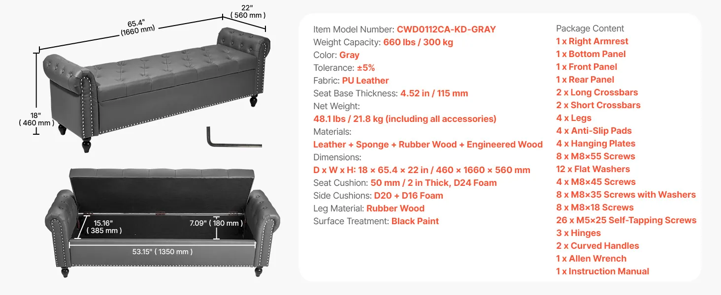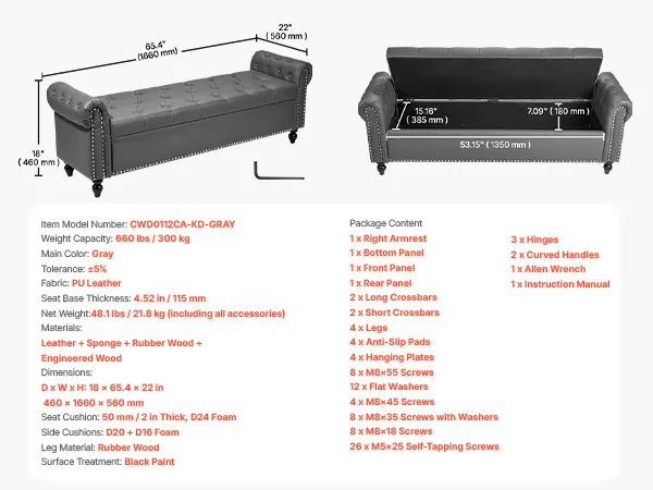 Wzmocnione podparcie: Ta skórzana ławka ze schowkiem oferuje mocne i trwałe podparcie dzięki solidnym nogom z drewna kauczukowego i solidnej ramie z drewna. Wytrzymuje obciążenie do 300 kg (660 funtów). Zaprojektowana do codziennego użytku, bez chwiania się i zapadania. Wymiary ławki: 460 x 1660 x 560 mm (18 x 65,4 x 22 cale).