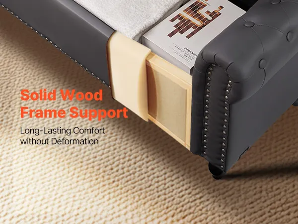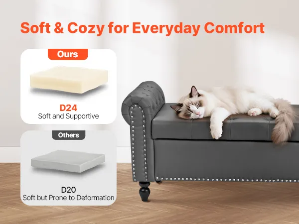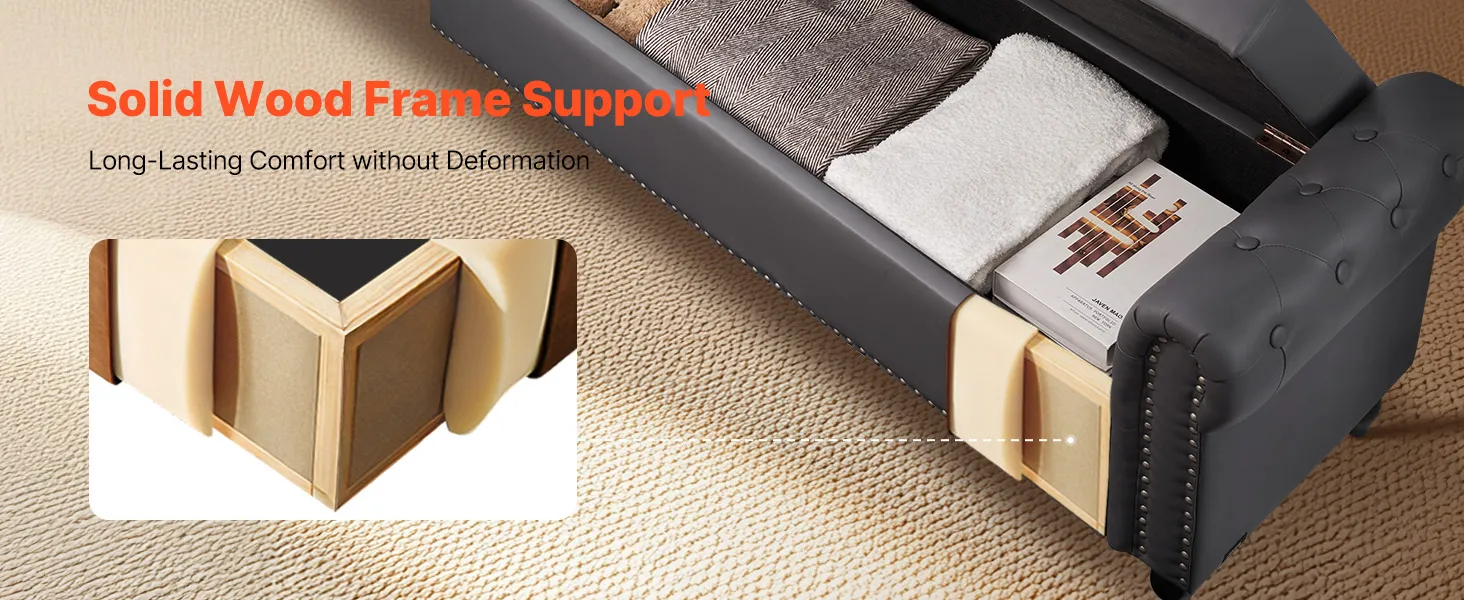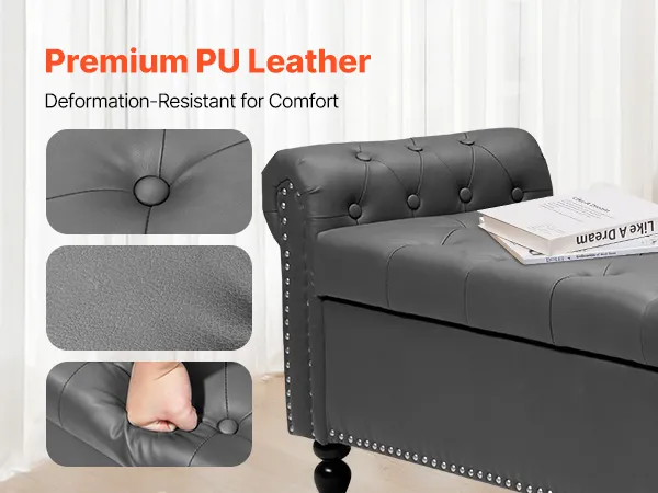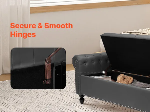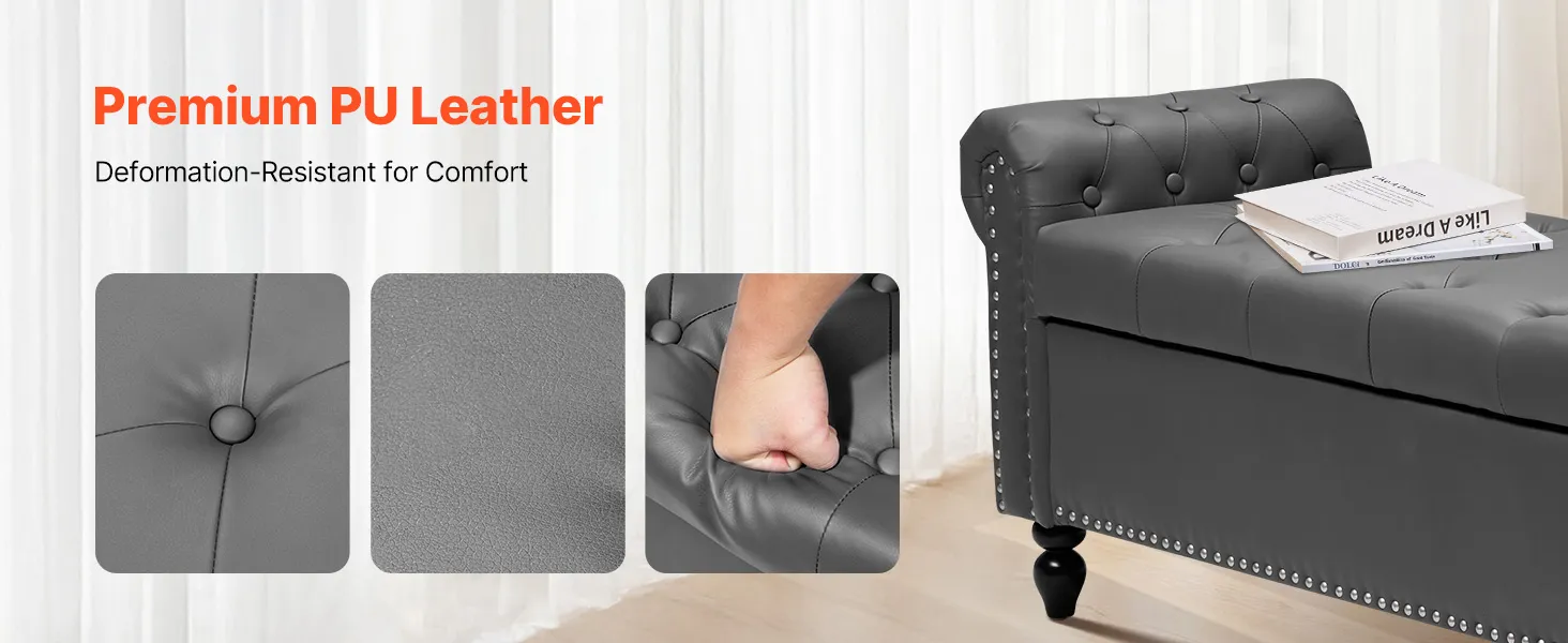 Gładka skóra PU: Wysokiej jakości skóra PU o jedwabistej fakturze i wyrafinowanych przeszyciach. Wodoodporna i łatwa w czyszczeniu, idealna do zapracowanych gospodarstw domowych. Nasza ławka z pojemnikiem do łóżka doda Twojej sypialni nowoczesnego, wyrafinowanego akcentu.