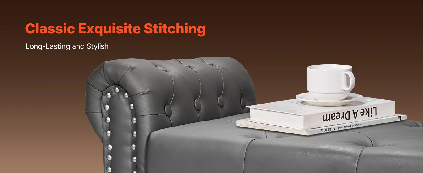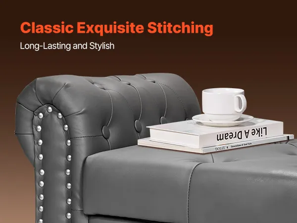 Ławka pufowa VEVOR (460 x 1660 x 560 mm) wykonana ze skóry PU z drewnianymi nogami i miejscem do przechowywania, przeszyciami na guziki i zwijanymi podłokietnikami, ławka na buty o nośności 300 kg, ławka do łóżka, ławka do sypialni, szara