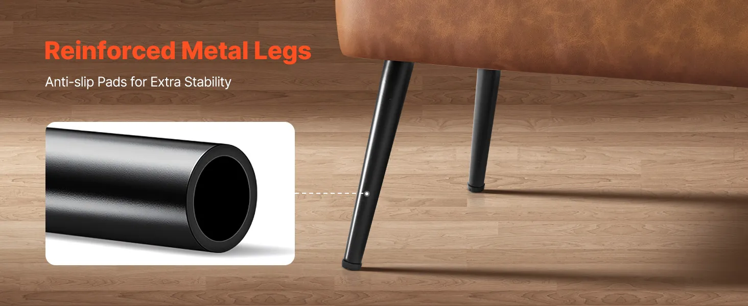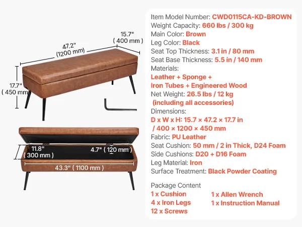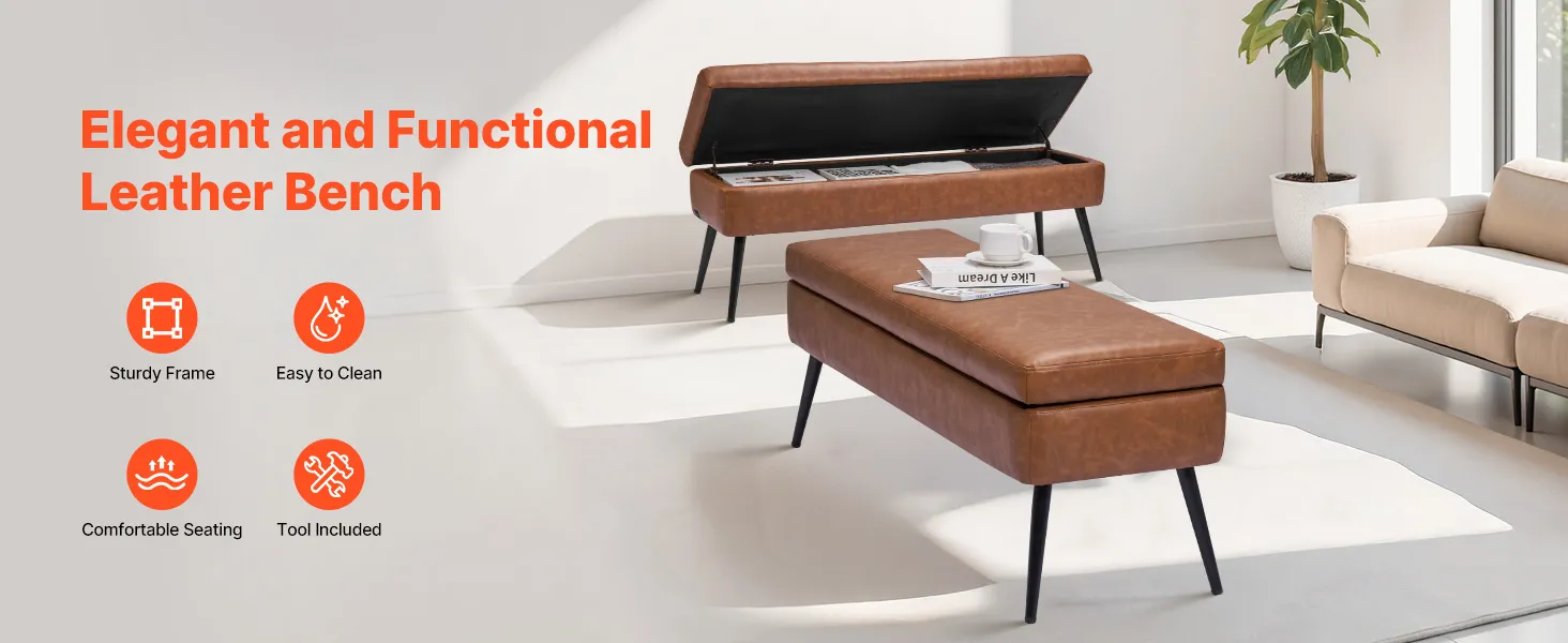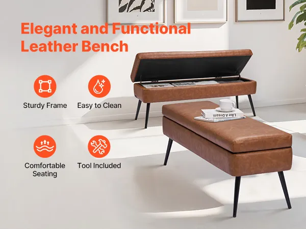 Ławka pufowa VEVOR (40 x 120 x 45 cm) wykonana ze skóry ekologicznej z metalowymi nogami i miejscem do przechowywania, tapicerowana ławka na buty o udźwigu 300 kg, nowoczesna ławka do łóżka, sypialni, salonu i jadalni, brązowa