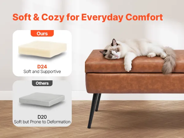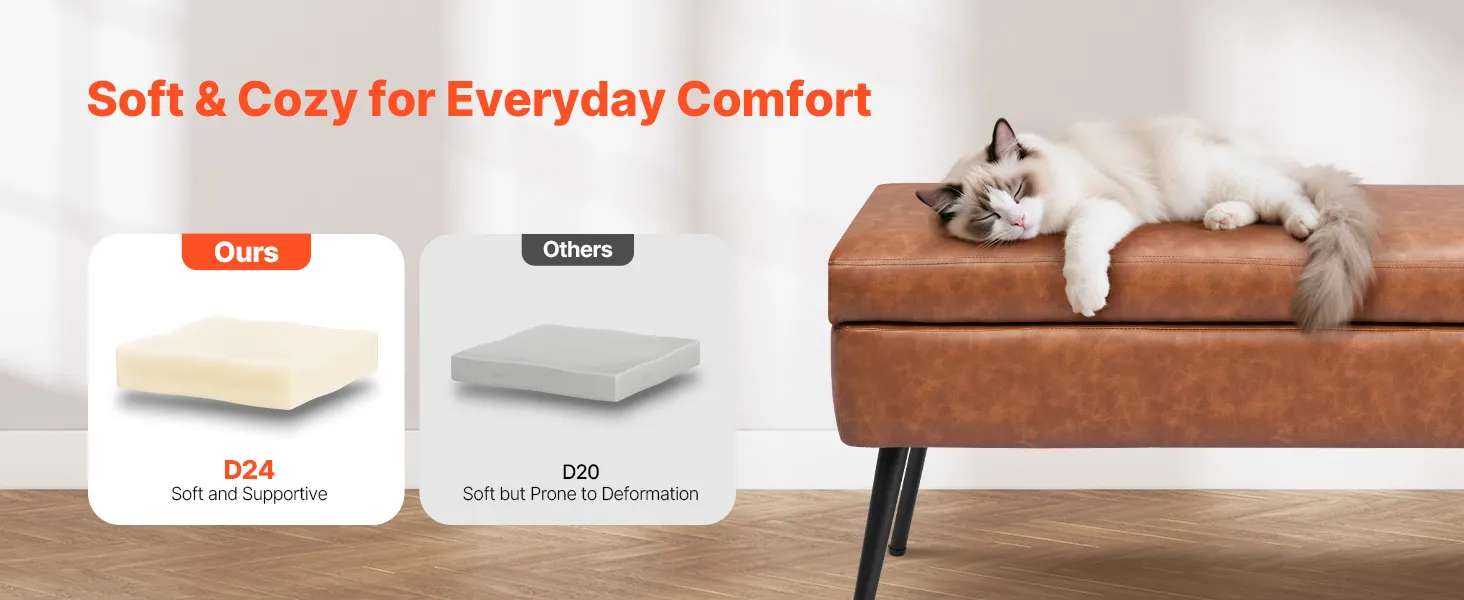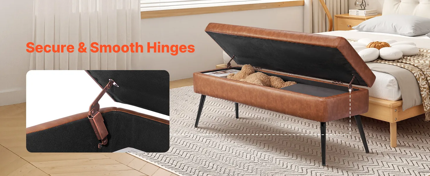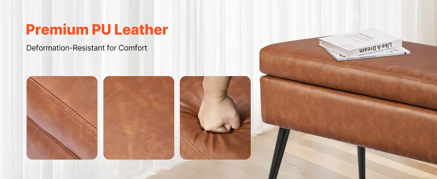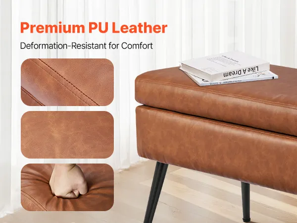 Gładka skóra PU: Wysokiej jakości skóra PU o jedwabistej fakturze i wyrafinowanych przeszyciach. Wodoodporna i łatwa w czyszczeniu, idealna do zapracowanych gospodarstw domowych. Nasza ława ze schowkiem doda Twojej sypialni nowoczesnego, wyrafinowanego akcentu.