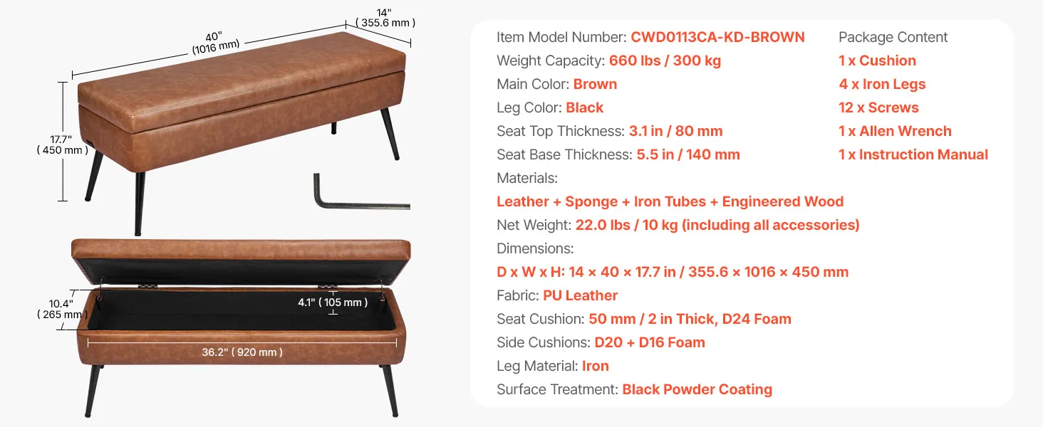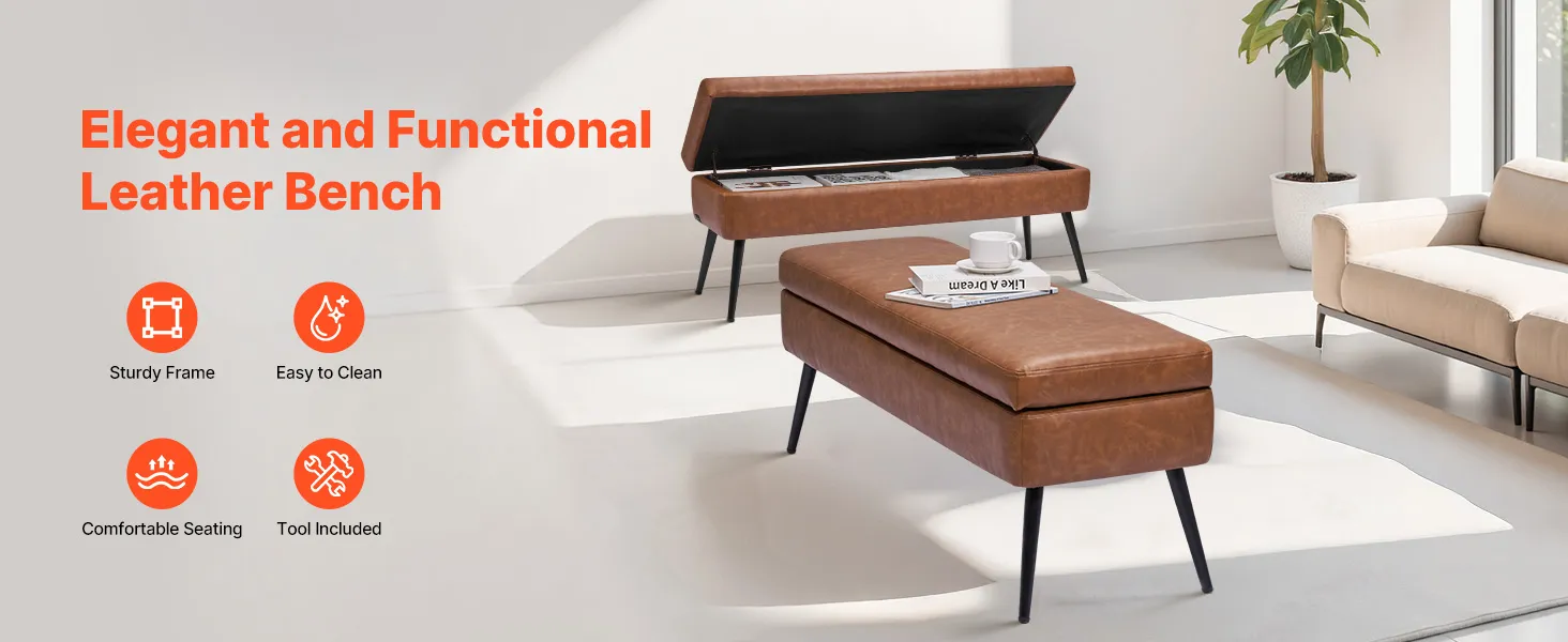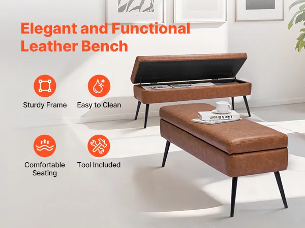 Ławka pufowa VEVOR (355 x 1015 x 450 mm) wykonana ze skóry ekologicznej z metalowymi nogami i miejscem do przechowywania, tapicerowana ławka na buty o udźwigu 300 kg, nowoczesna ławka do łóżka, sypialni, salonu i jadalni, brązowa